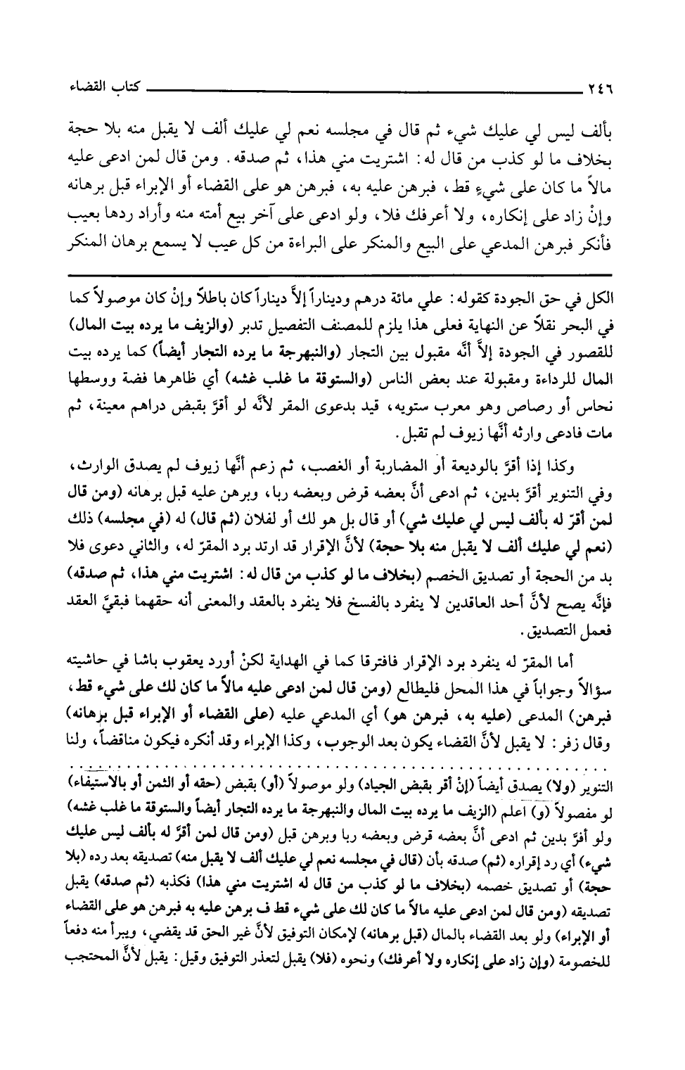 ومن قال لمن أقر له بألف ليس لي عليك شيء أو قال بل هو لك أو لفلان ثم قال له في مجلسه ذلك نعم لي عليك ألف لا يقبل منه بلا حجة لأن الإقرار قد ارتد برد المقر له والثاني دعوى فلا بد من الحجة أو تصديق الخصم بخلاف ما لو كذب من قال له اشتريت مني هذا ثم صدقه فإنه يصح لأن أحد العاقدين لا ينفرد بالفسخ فلا ينفرد بالعقد والمعنى أنه حقهما فبقي العقد فعمل التصديق أما المقر له ينفرد برد الإقرار فافترقا كما في الهداية لكن أورد يعقوب باشا في حاشيته سؤالا وجوابا في هذا المحل فليطالع