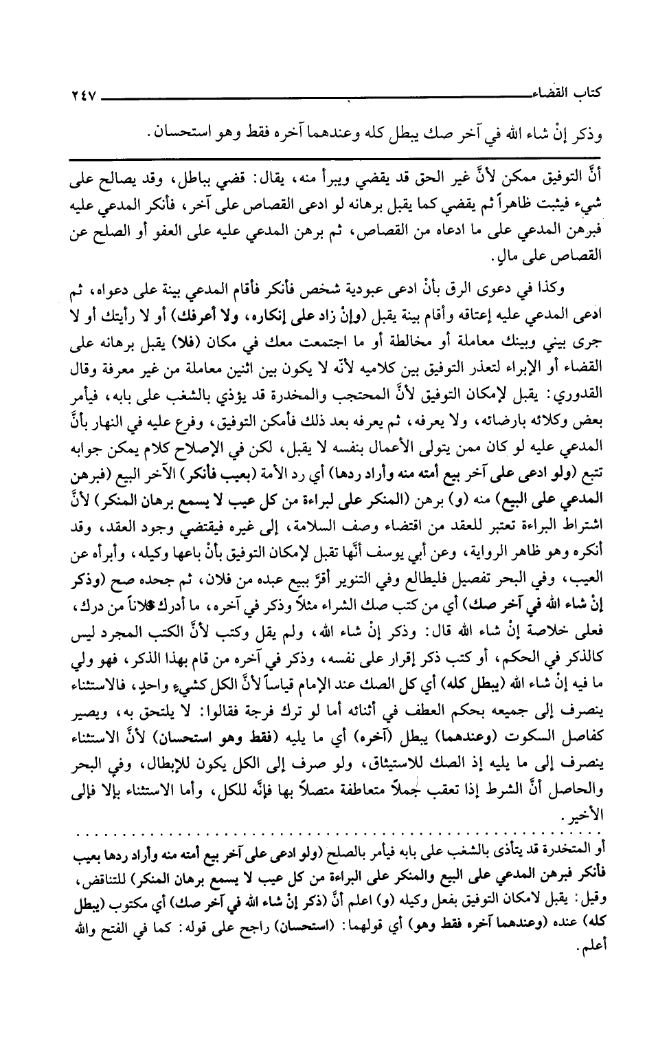 أن التوفيق ممكن لأن غير الحق قد يقضى ويبرأ منه يقال قضى بباطل وقد يصالح على شيء فيثبت ظاهرا ثم يقضى كما يقبل برهانه لو ادعى القصاص على آخر فأنكر المدعى عليه فبرهن المدعي على ما ادعاه من القصاص ثم برهن المدعى عليه على العفو أو الصلح عن القصاص على مال وكذا في دعوى الرق بأن ادعى عبودية شخص فأنكر فأقام المدعي بينة على دعواه ثم ادعى المدعى عليه إعتاقه وأقام بينة تقبل