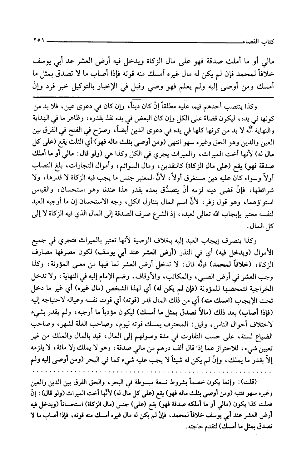 ولو قال مالي أو ما أملك صدقة فهو يقع على مال الزكاة كالنقدين ومال السوائم وأموال التجارات بلغ النصاب أو لا وسواء كان عليه دين مستغرق أو لا لأن المعتبر جنس ما يجب فيه الزكاة لا قدرها ولا شرائطها فإن قضى دينه لزمه أن يتصدق بعده بقدر هذا عندنا وهو استحسان والقياس استواؤهما وهو قول زفر لأن اسم المال يتناول الكل وجه الاستحسان أن ما أوجبه العبد لنفسه معتبر بإيجاب الله تعالى لعبده إذ الشرع صرف الصدقة إلى المال الذي فيه الزكاة لا إلى كل المال وكذا ينصرف إيجاب العبد إليه بخلاف الوصية لأنها تعتبر بالميراث فتجري في جميع الأموال ويدخل فيه أي في النذر أرض العشر عند أبي يوسف لكون مصرفها مصارف الزكاة خلافا لمحمد فإنه قال لا تدخل أرض العشر لما فيها من معنى المئونة وكذا وجب العشر في أرض الصبي والمكاتب والأوقاف وضم الإمام إليه في النهاية ولا تدخل الخراجية لتمحضها للمئونة فإن لم يكن له أي لهذا الشخص مال غيره أي غير ما دخل تحت الإيجاب أمسك منه أي من ذلك المال قدر قوته أي قوت نفسه وعياله لاحتياجه إليه فإذا أصاب بعد ذلك مالا تصدق بمثل ما أمسك ليكون مؤديا ما أوجبه ولم يقدر بشيء لاختلاف أحوال الناس وقيل المحترف يمسك قوته ليوم وصاحب الغلة لشهر وصاحب الضياع لسنة على حسب التفاوت في مدة وصولهم إلى المال