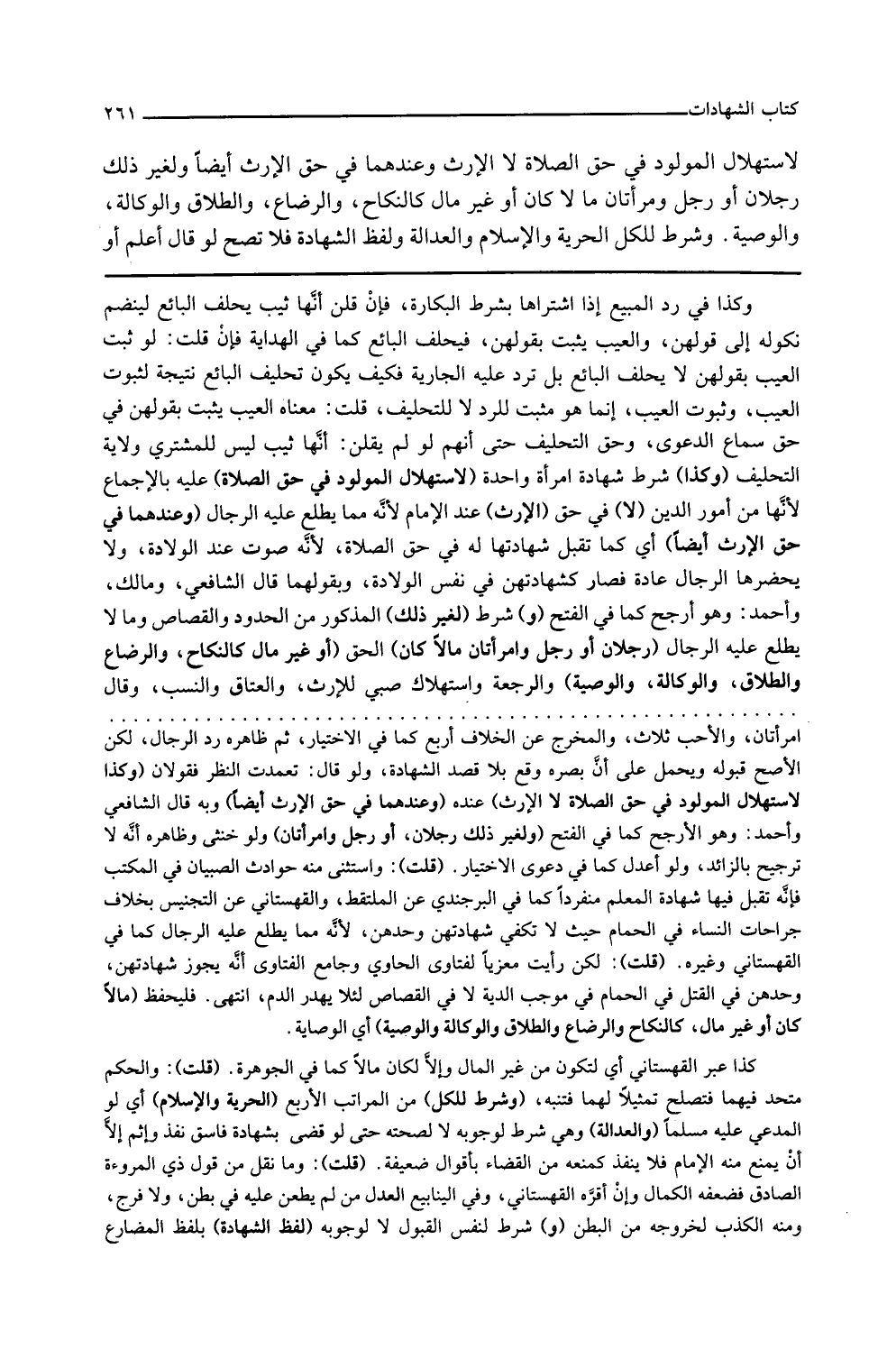 و شرط لغير ذلك المذكور من الحدود والقصاص وما لا يطلع عليه الرجال رجلان أو رجل وامرأتان مالا كان الحق أو غير مال كالنكاح والرضاع والطلاق والوكالة والوصية والرجعة واستهلاك صبي للإرث والعتاق والنسب