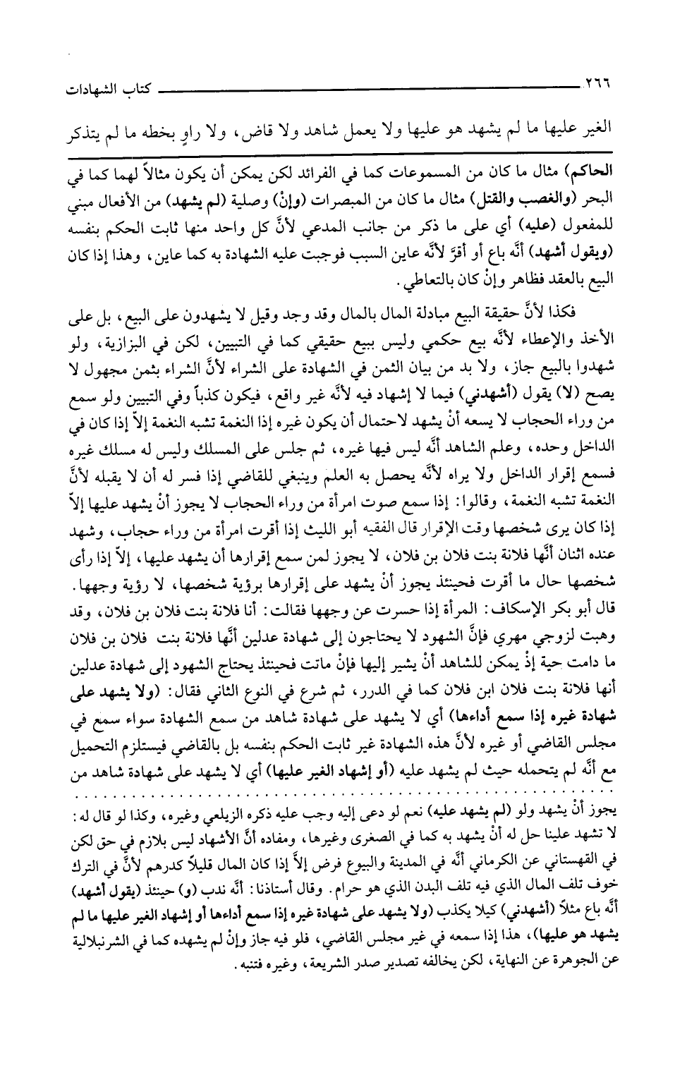 وإن وصلية لم يشهد من الأفعال مبني للمفعول عليه أي على ما ذكر من جانب المدعي لأن كل واحد منهما ثابت الحكم بنفسه ويقول اشهد أنه باع أو أقر لأنه عاين السبب فوجبت عليه الشهادة به كما عاين وهذا إذا كان البيع بالعقد فظاهر وإن كان بالتعاطي فكذا لأن حقيقة البيع مبادلة المال بالمال وقد وجد وقيل لا يشهدون على البيع بل على الأخذ والإعطاء لأنه بيع حكمي وليس ببيع حقيقي كما في التبيين لكن في البزازية ولو شهدوا بالبيع جاز ولا بد من بيان الثمن في الشهادة على الشراء لأن الشراء بثمن مجهول لا يصح لا يقول اشهدني فيما لا إشهاد فيه لأنه غير واقع فيكون كذبا