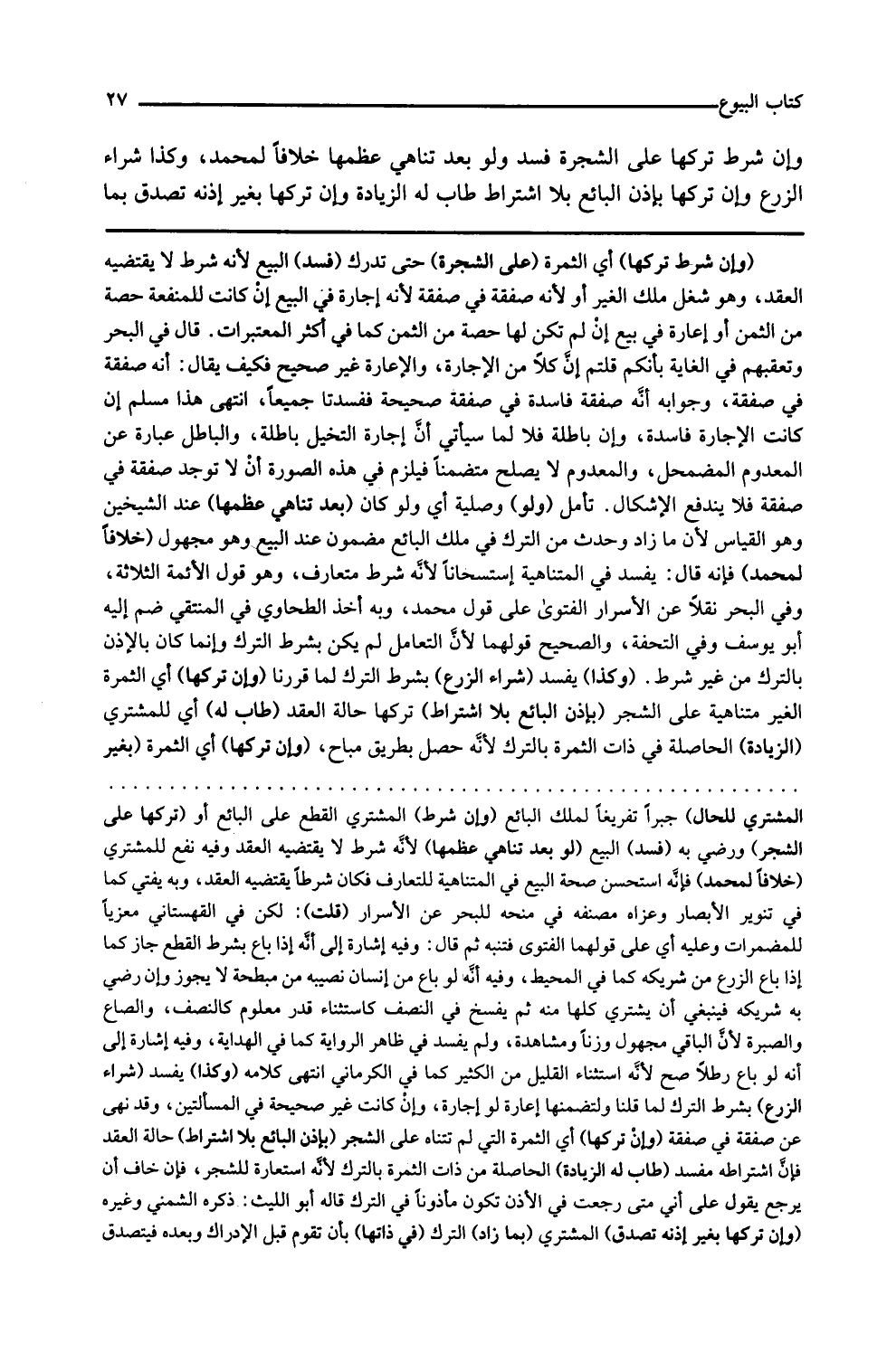 وإن شرط تركها أي الثمرة على الشجرة حتى تدرك فسد البيع لأنه شرط لا يقتضيه العقد وهو شغل ملك الغير أو لأنه صفقة في صفقة لأنه إجارة في البيع إن كانت للمنفعة حصة من الثمن أو إعارة في بيع إن لم تكن له حصة من الثمن كما في أكثر المعتبرات قال في البحر وتعقبهم في الغاية بأنكم قلتم أن كلا من الإجارة والإعارة غير صحيح فكيف يقال أنه صفقة في صفقة وجوابه أنه صفقة فاسدة في صفقة صحيحة ففسدتا جميعا انتهى هذا مسلم إن كانت الإجارة فاسدة وإن باطلة فلا لما سيأتي أن إجارة النخيل باطلة والباطل عبارة عن المعدوم المضمحل والمعدوم لا يصلح متضمنا فيلزم في هذه الصورة أن لا توجد صفقة في صفقة فلا يندفع الإشكال تأمل