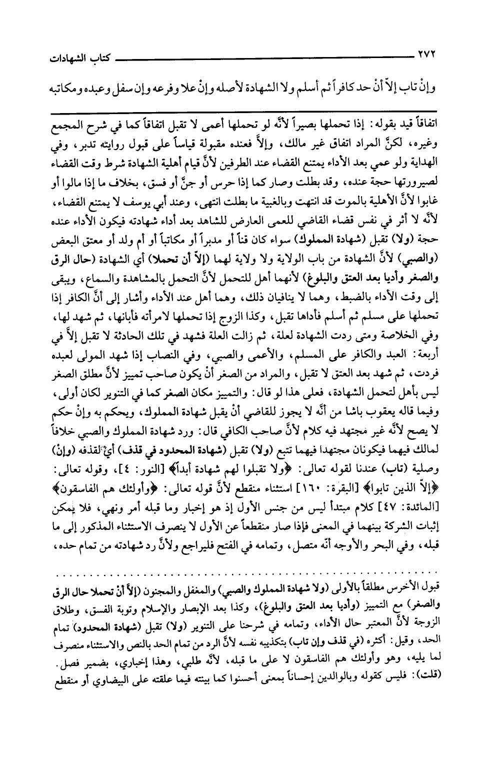 ولا تقبل شهادة المملوك سواء كان قنا أو مدبرا أو مكاتبا أو أم ولد أو معتق البعض والصبي لأن الشهادة من باب الولاية ولا ولاية لهما إلا إن تحملا أي الشهادة حال الرق والصغر وأديا بعد العتق والبلوغ لأنهما أهل للتحمل لأن التحمل بالمشاهدة والسماع ويبقى إلى وقت الأداء بالضبط وهما لا ينافيان ذلك وهما أهل عند الأداء وأشار إلى أن الكافر إذا تحملها على مسلم ثم أسلم فأداها تقبل وكذا الزوج إذا تحملها لامرأته فأبانها ثم شهد لها