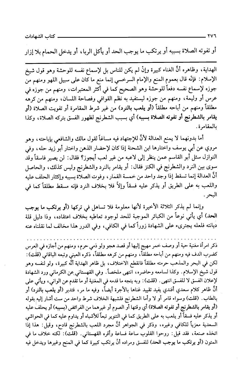 أو يلعب بالنرد من غير شرط المقامرة أو تفويت الصلاة أو يقامر بالشطرنج أو تفوته الصلاة بسببه أي بسبب الشطرنج لظهور الفسق بتركه الصلاة وكذا بالمقامرة أما بدونهما لا يمنع العدالة لأن للاجتهاد فيه مساغا لقول مالك والشافعي بإباحته وهو مروي عن أبي يوسف واختارها ابن الشحنة إذا كان لإحضار الذهن واختار أبو زيد حله