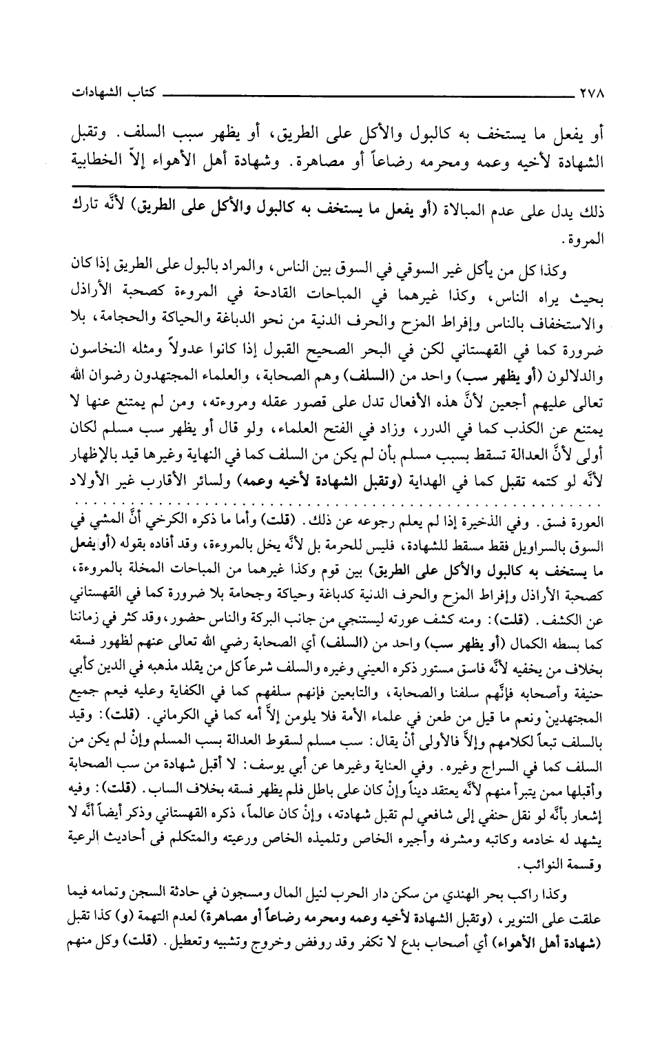 ذلك يدل على عدم المبالاة أو يفعل ما يستخف به كالبول والأكل على الطريق لأنه تارك المروءة وكذا كل من يأكل غير السوقي في السوق بين الناس والمراد بالبول على الطريق إذا كان بحيث يراه الناس وكذا غيرهما في المباحات القادحة في المروءة كصحبة الأراذل والاستخفاف بالناس وإفراط المزح والحرف الدنية من نحو الدباغة والحياكة والحجامة بلا ضرورة كما في القهستاني لكن في البحر الصحيح القبول إذا كانوا عدولا ومثله النخاسون والدلالون أو يظهر سب واحد من السلف وهم الصحابة والعلماء المجتهدون رضوان الله تعالى عليهم أجمعين لأن هذه الأفعال تدل على قصور عقله ومروءته ومن لم يمتنع عنها لا يمتنع عن الكذب كما في الدرر وزاد في الفتح العلماء ولو قال أو يظهر سب مسلم لكان أولى لأن العدالة تسقط بسب مسلم بأن لم يكن من السلف كما في النهاية وغيرها قيد بالإظهار لأنه لو كتمه تقبل كما في الهداية