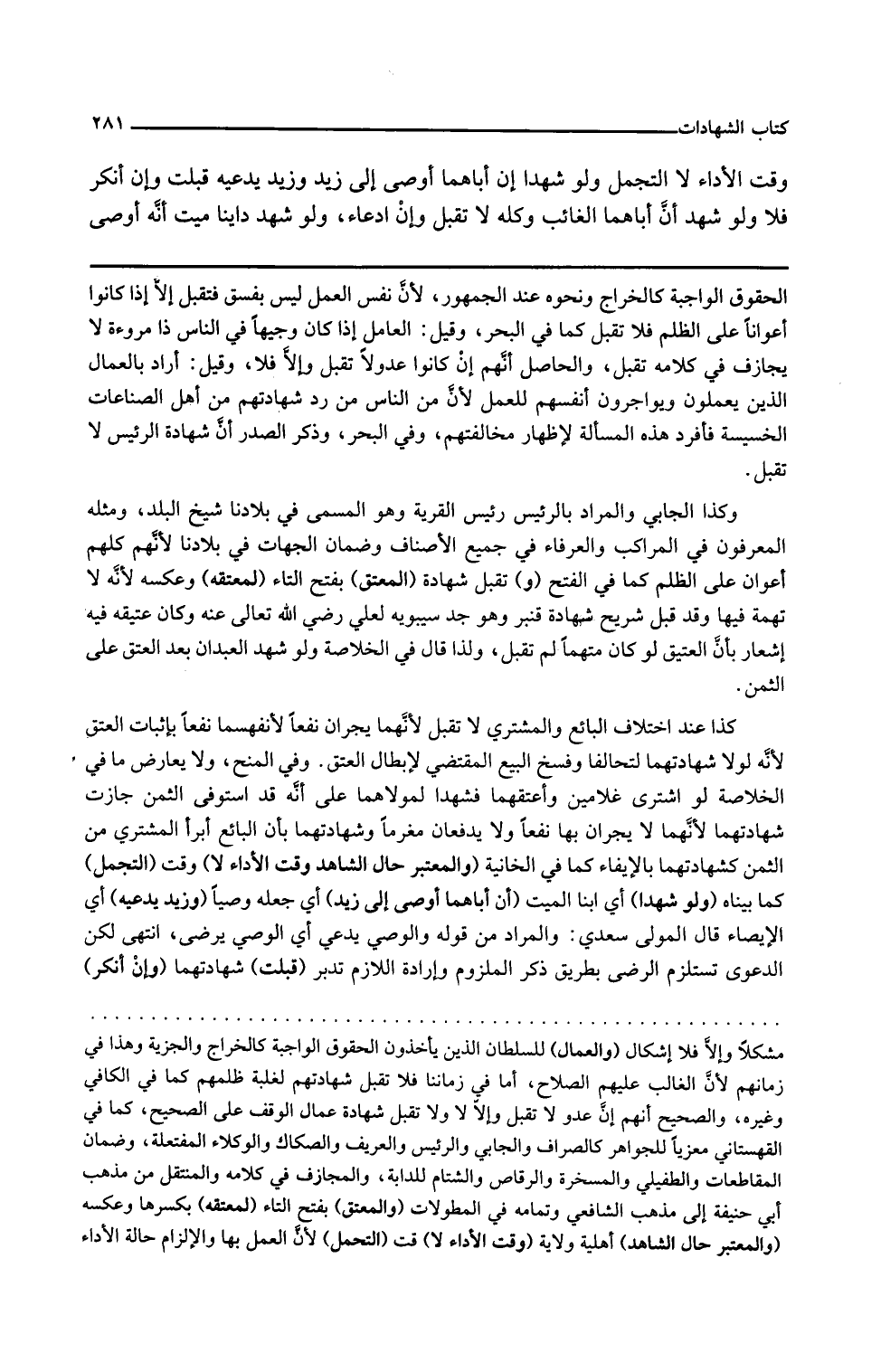 وفي البحر وذكر الصدر أن شهادة الرئيس لا تقبل وكذا الجابي والمراد بالرئيس رئيس القرية وهو المسمى في بلادنا شيخ البلد ومثله المعرفون في المراكب والعرفاء في جميع الأصناف وضمان الجهات في بلادنا لأنهم كلهم أعوان على الظلم كما في الفتح