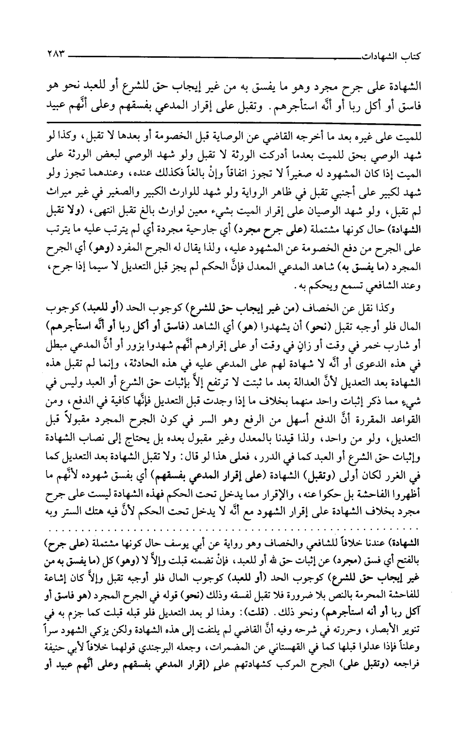 ولا تقبل الشهادة حال كونها مشتملة على جرح مجرد أي جارحية مجردة أي لم يترتب عليه ما يترتب على الجرح من دفع الخصومة عن المشهود عليه ولذا يقال له الجرح المفرد وهو أي الجرح المجرد ما يفسق به شاهد المدعي المعدل فإن الحكم لم يجز قبل التعديل لا سيما إذا جرح وعند الشافعي تسمع ويحكم به وكذا نقل عن الخصاف من غير إيجاب حق للشرع كوجوب الحد أو للعبد كوجوب المال فلو أوجبه تقبل نحو أن يشهدوا هو أي الشاهد فاسق أو آكل ربا وأنه استأجرهم أو شارب خمر في وقت أو زان في وقت أو على إقرارهم أنهم شهدوا بزور أو أن المدعي مبطل في هذه الدعوى أو أنه لا شهادة لهم على المدعى عليه في هذه الحادثة وإنما لم تقبل هذه الشهادة بعد التعديل لأن العدالة بعدما ثبتت لا ترتفع إلا بإثبات حق الشرع أو العبد وليس في شيء مما ذكر إثبات واحد منهما بخلاف ما إذا وجدت قبل التعديل فإنها كافية في الدفع ومن القواعد المقررة أن الدفع أسهل من الرفع وهو السر في كون الجرح المجرد مقبولا قبل التعديل ولو من واحد ولذا قيدنا بالمعدل وغير مقبول بعده بل يحتاج إلى نصاب الشهادة وإثبات حق الشرع أو العبد كما في الدرر فعلى هذا لو قال ولا تقبل الشهادة بعد التعديل كما في الغرر لكان أولى