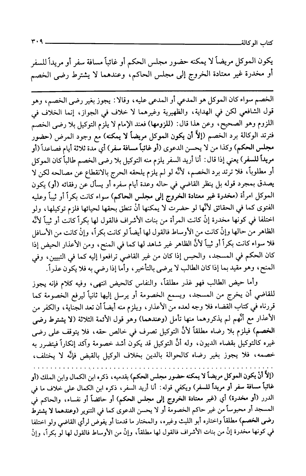 الخصم سواء كان الموكل هو المدعي أو المدعى عليه وقالا يجوز بغير رضى الخصم وهو قول الشافعي لكن في الهداية والظهيرية وغيرهما لا خلاف في الجواز إنما الخلاف في اللزوم وهو الصحيح وعن هذا قال للزومها فعند الإمام لا يلزم التوكيل بلا رضى الخصم فترتد الوكالة برد الخصم إلا أن يكون الموكل مريضا لا يمكنه مع وجود المرض حضور مجلس الحكم وكذا من لا يحسن الدعوى أو غائبا مسافة سفر أي مدة ثلاثة أيام فصاعدا أو مريدا للسفر يعني إذا قال أنا أريد السفر يلزم منه التوكيل بلا رضى الخصم طالبا كان الموكل أو مطلوبا فلا ترتد برد الخصم لأنه لو لم يلزم يلحقه الحرج بالانقطاع عن مصالحه لكن لا يصدق بمجرد قوله بل ينظر القاضي في حاله وعدة أيام سفره أو يسأل عن رفقائه أو يكون الموكل امرأة مخدرة غير معتادة الخروج إلى مجلس الحاكم سواء كانت بكرا أو ثيبا وعليه الفتوى كما في الحقائق لأنها لو حضرت لا يمكنها أن تنطق بحقها لحيائها فلزم توكيلها ولو اختلفا في كونها مخدرة إن كانت المرأة من بنات الأشراف فالقول لها بكرا كانت أو ثيبا لأنه الظاهر من حالها وإن كانت من الأوساط فالقول لها أيضا لو كانت بكرا وإن كانت من الأسافل فلا سواء كانت بكرا أو ثيبا لأن الظاهر غير شاهد لها كما في المنح