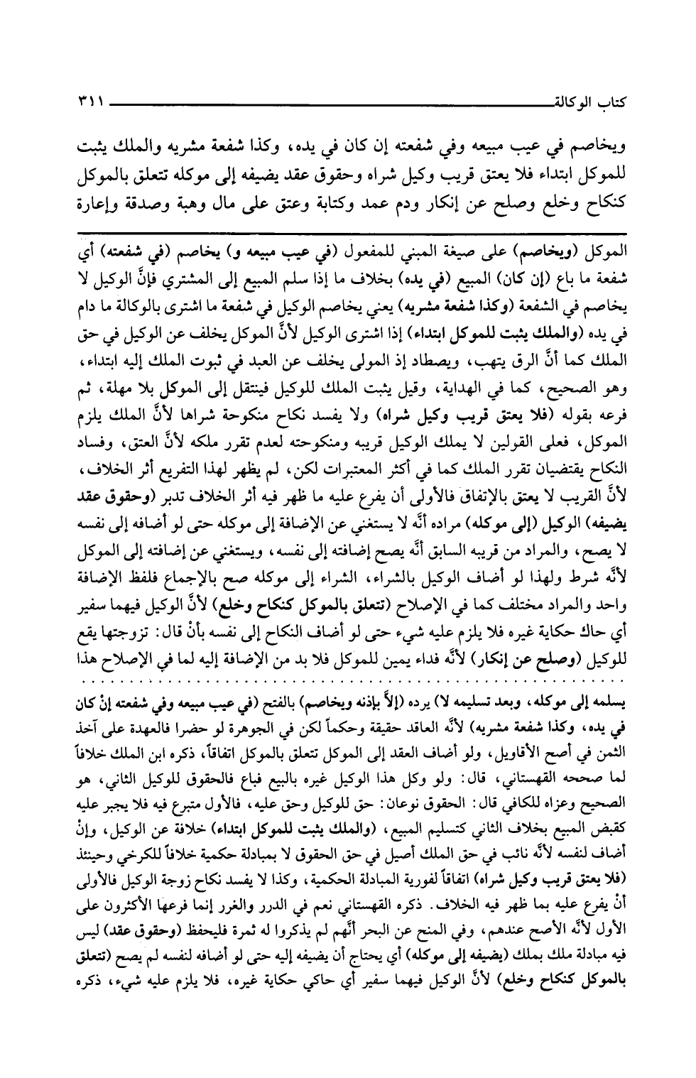 وكذا شفعة مشريه يعني يخاصم الوكيل في شفعة ما اشترى بالوكالة ما دام في يده والملك يثبت للموكل ابتداء إذا اشترى الوكيل لأن الموكل يخلف عن الوكيل في حق الملك كما أن الرق يتهب ويصطاد إذ المولى يخلف عن العبد في ثبوت الملك إليه ابتداء وهو الصحيح كما في الهداية وقيل يثبت الملك للوكيل فينتقل إلى الموكل بلا مهلة ثم فرعه بقوله فلا يعتق قريب وكيل شراه ولا يفسد نكاح منكوحة شراها لأن الملك يلزم الموكل فعلى القولين لا يملك الوكيل قريبه ومنكوحته لعدم تقرر ملكه لأن العتق وفساد النكاح يقتضيان تقرر الملك كما في أكثر المعتبرات لكن لم يظهر لهذا التفريع أثر الخلاف لأن القريب لا يعتق بالاتفاق فالأولى أن يفرع عليه ما ظهر فيه أثر الخلاف تدبر وحقوق عقد يضيفه الوكيل إلى موكله مراده أنه لا يستغني عن الإضافة إلى موكله حتى لو أضافه إلى نفسه لا يصح والمراد من قريبه السابق أنه يصح إضافته إلى نفسه ويستغني عن إضافته إلى الموكل لأنه شرط ولهذا لو أضاف الوكيل بالشراء الشراء إلى موكله صح بالإجماع فلفظ الإضافة واحد والمراد مختلف كما في الإصلاح تتعلق بالموكل كنكاح وخلع لأن الوكيل فيهما سفير أي حاك حكاية غيره فلا يلزم عليه شيء حتى لو أضاف النكاح إلى نفسه بأن قال تزوجتها يقع للوكيل وصلح عن إنكار لأنه فداء يمين للموكل فلا بد من الإضافة إليه لما في الإصلاح هذا