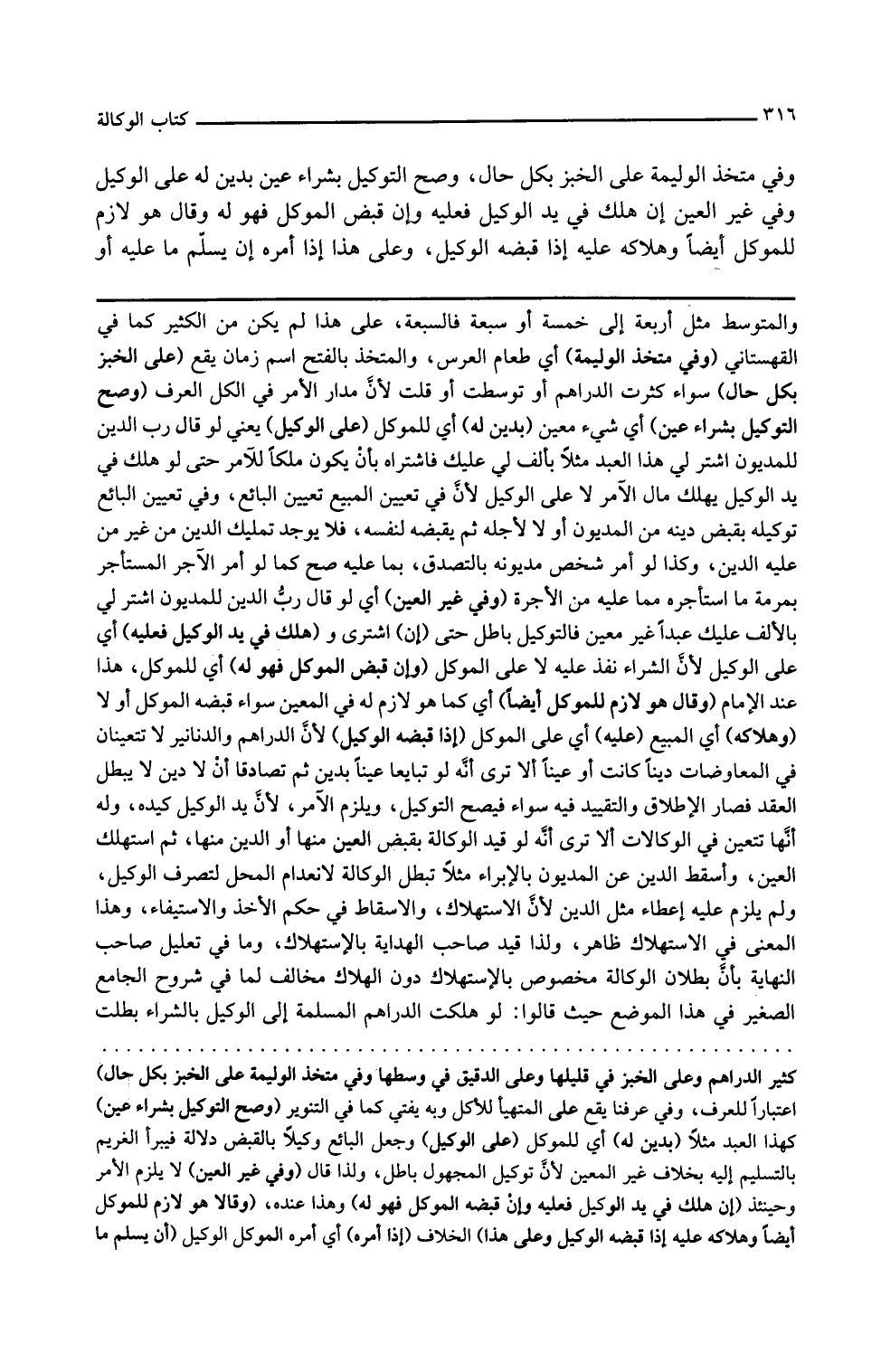 وصحح التوكيل بشراء عين أي شيء معين بدين له أي للموكل على الوكيل يعني لو قال رب الدين للمديون اشتر لي هذا العبد مثلا بألف لي عليك فاشتراه بأن يكون ملكا للآمر حتى لو هلك في يد الوكيل يهلك مال الآمر لا على الوكيل لأن في تعيين المبيع تعيين البائع وفي تعيين البائع توكيله بقبض دينه من المديون أولا لأجله ثم يقبضه لنفسه فلا يوجد تمليك الدين من غير من عليه الدين وكذا لو أمر شخص مديونه بالتصديق بما عليه صح كما لو أمر الآجر المستأجر بمرمة ما استأجره مما عليه من الأجرة وفي غير العين أي لو قال رب الدين للمديون اشتر لي بالألف عليك عبدا غير معين فالتوكيل باطل حتى إن اشترى و هلك في يد الوكيل فعليه أي على الوكيل لأن الشراء نفذ عليه لا على الموكل