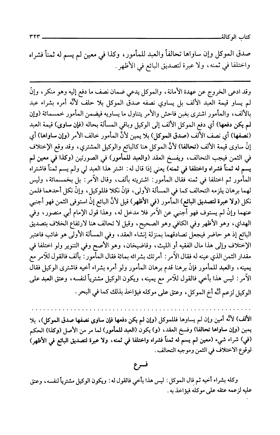 وقد ادعى الخروج عن عهدة الأمانة والموكل يدعي ضمان نصف ما دفع إليه وهو منكر وإن لم يساو قيمة العبد الألف بل يساوي نصفه صدق الموكل بلا خلف لأنه أمره بشراء عبد بالألف والمأمور اشترى بغبن فاحش والأمر يتناول ما يساويه فيضمن المأمور خمسمائة