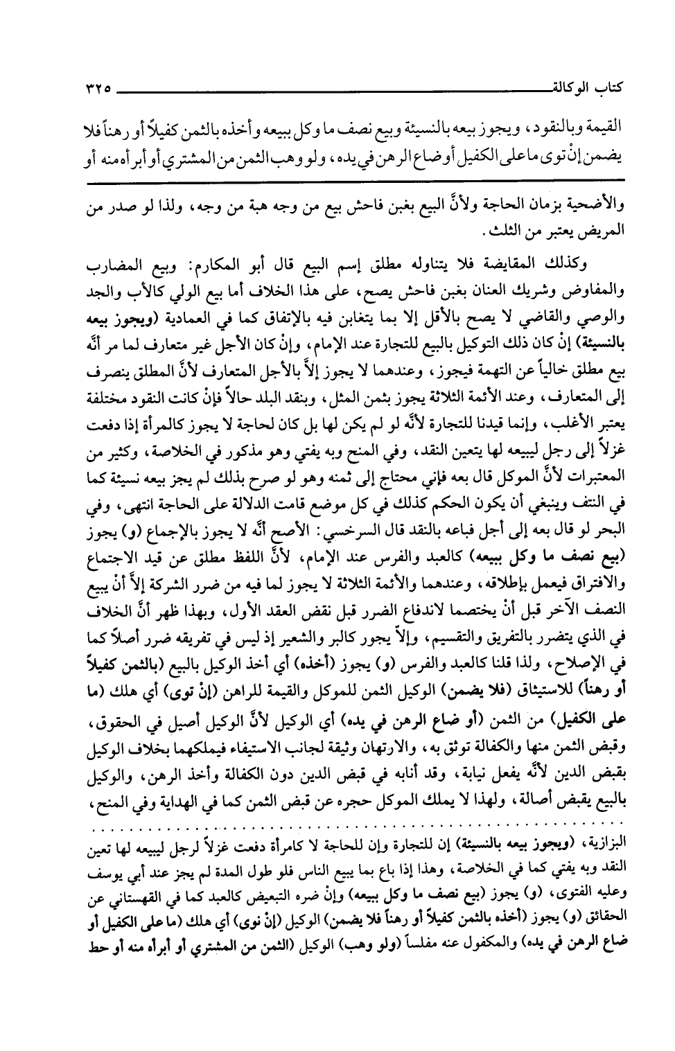 والأضحية بزمان الحاجة ولأن البيع بغبن فاحش بيع من وجه هبة من وجه ولذا لو صدر من المريض يعتبر من الثلث وكذلك المقايضة فلا يتناوله مطلق اسم البيع قال أبو المكارم وبيع المضارب والمفاوض وشريك العنان بغبن فاحش يصح على هذا الخلاف أما بيع الولي كالأب والجد والوصي والقاضي لا يصح بالأقل إلا بما يتغابن فيه بالاتفاق كما في العمادية ويجوز بيعه بالنسيئة إن كان ذلك التوكيل بالبيع للتجارة عند الإمام وإن كان الأجل غير متعارف لما مر أنه بيع مطلق خاليا عن التهمة فيجوز وعندهما لا يجوز إلا بالأجل المتعارف لأن المطلق ينصرف إلى المتعارف وعند الأئمة الثلاثة يجوز بثمن المثل وبنقد البلد حالا فإن كانت النقود مختلفة يعتبر الأغلب وإنما قيدنا للتجارة لأنه لو لم يكن لها بل كان لحاجة لا يجوز كالمرأة إذا دفعت غزلا إلى رجل ليبيعه لها يتعين النقد