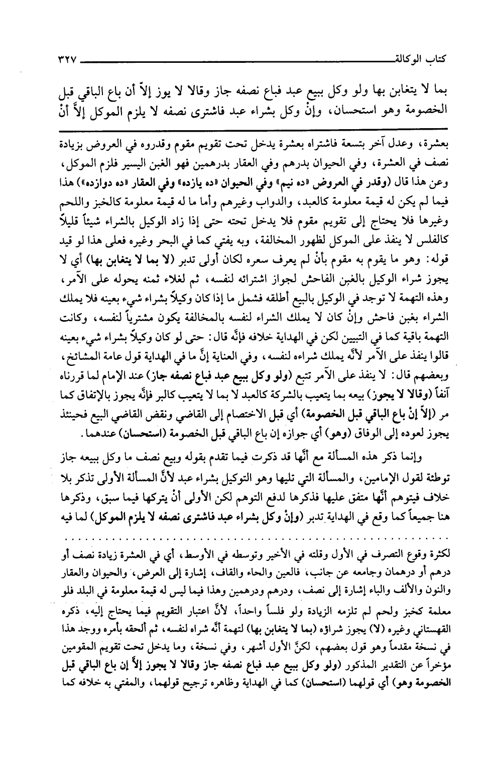 ولو وكل ببيع عبد فباع نصفه جاز عند الإمام لما قررناه آنفا وقالا لا يجوز بيعه بما يتعيب بالشركة كالعبد لا بما لا يتعيب كالبر فإنه يجوز بالاتفاق كما مر إلا إن باع الباقي قبل الخصومة أي قبل الاختصام إلى القاضي ونقض القاضي البيع فحينئذ يجوز لعوده إلى الوفاق وهو أي جوازه إن باع الباقي قبل الخصومة استحسان عندهما وإنما ذكر هذه المسألة مع أنها قد ذكرت فيما تقدم بقوله وبيع نصف ما وكل ببيعه جاز توطئة لقول الإمامين والمسألة التي تليها وهو التوكيل بشراء عبد لأن المسألة الأولى تذكر بلا خلاف فيتوهم أنها متفق عليها فذكرها لدفع التوهم لكن الأولى أن يتركها فيما سبق وذكرها هنا جميعا كما وقع في الهداية تدبر