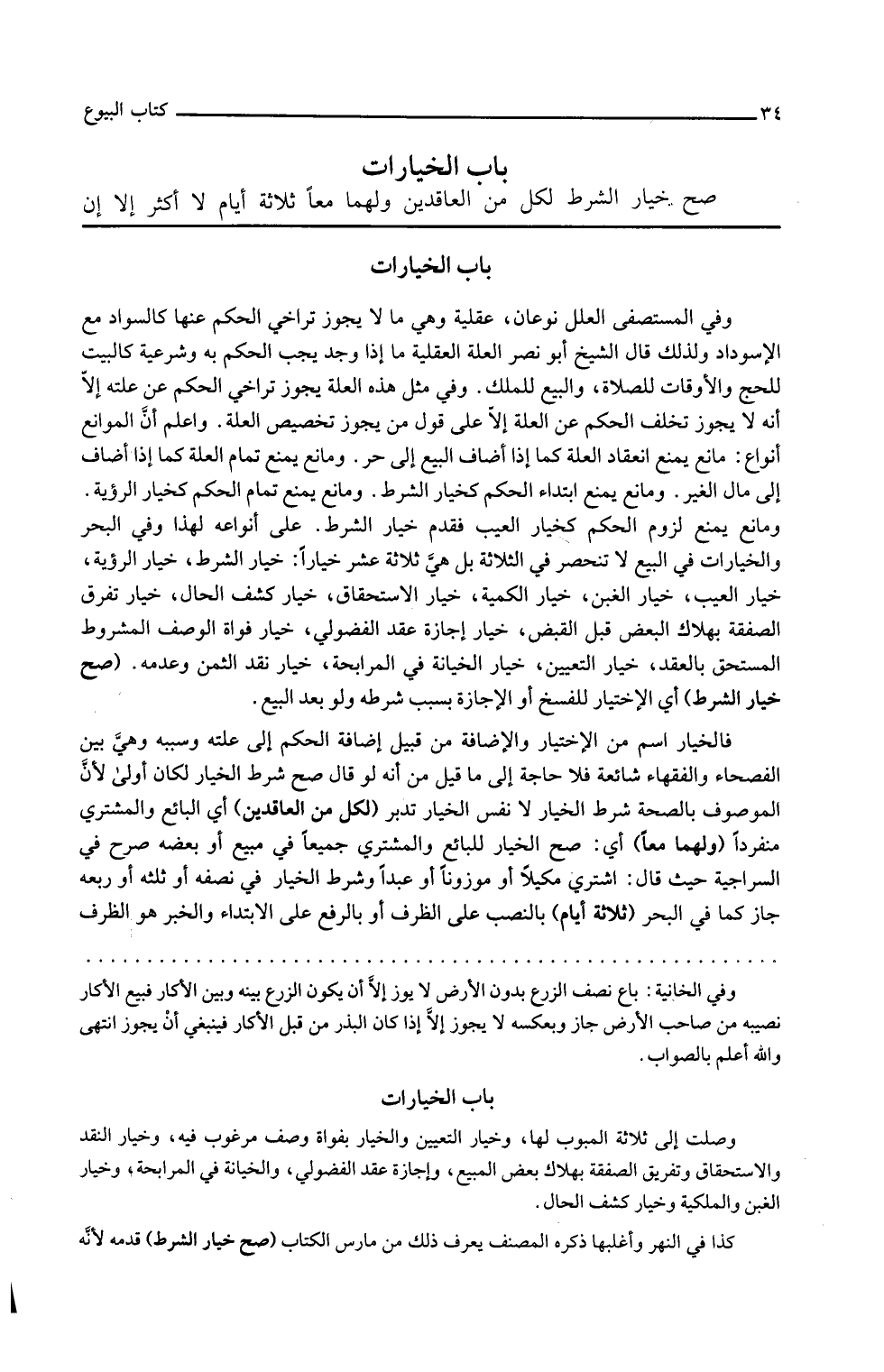 خيار الشرط خيار الرؤية خيار العيب خيار الغبن خيار الكمية خيار الاستحقاق خيار كشف الحال خيار تفرق الصفقة بهلاك البعض قبل القبض خيار إجازة عقد الفضولي خيار فوات الوصف المشروط المستحق بالعقد خيار التعيين خيار الخيانة في المرابحة خيار نقد الثمن وعدمه صح خيار الشرط أي الاختيار للفسخ أو الإجازة بسبب شرطه ولو بعد البيع فالخيار اسم من الاختيار والإضافة من قبيل إضافة الحكم إلى علته وسببه وهي بين الفصحاء والفقهاء شائعة فلا حاجة إلى ما قيل من أنه لو قال صح شرط الخيار لكان أولى لأن الموصوف بالصحة شرط الخيار لا نفس الخيار تدبر لكل من العاقدين أي البائع والمشتري منفردا ولهما معا أي صح الخيار للبائع والمشتري جميعا في مبيع أو بعضه صرح في السراجية حيث قال اشترى مكيلا أو موزونا أو عبدا وشرط الخيار في نصفه أو ثلثه أو ربعه جاز كما في البحر ثلاثة أيام بالنصب على الظرف أو بالرفع على الابتداء والخبر هو الظرف
