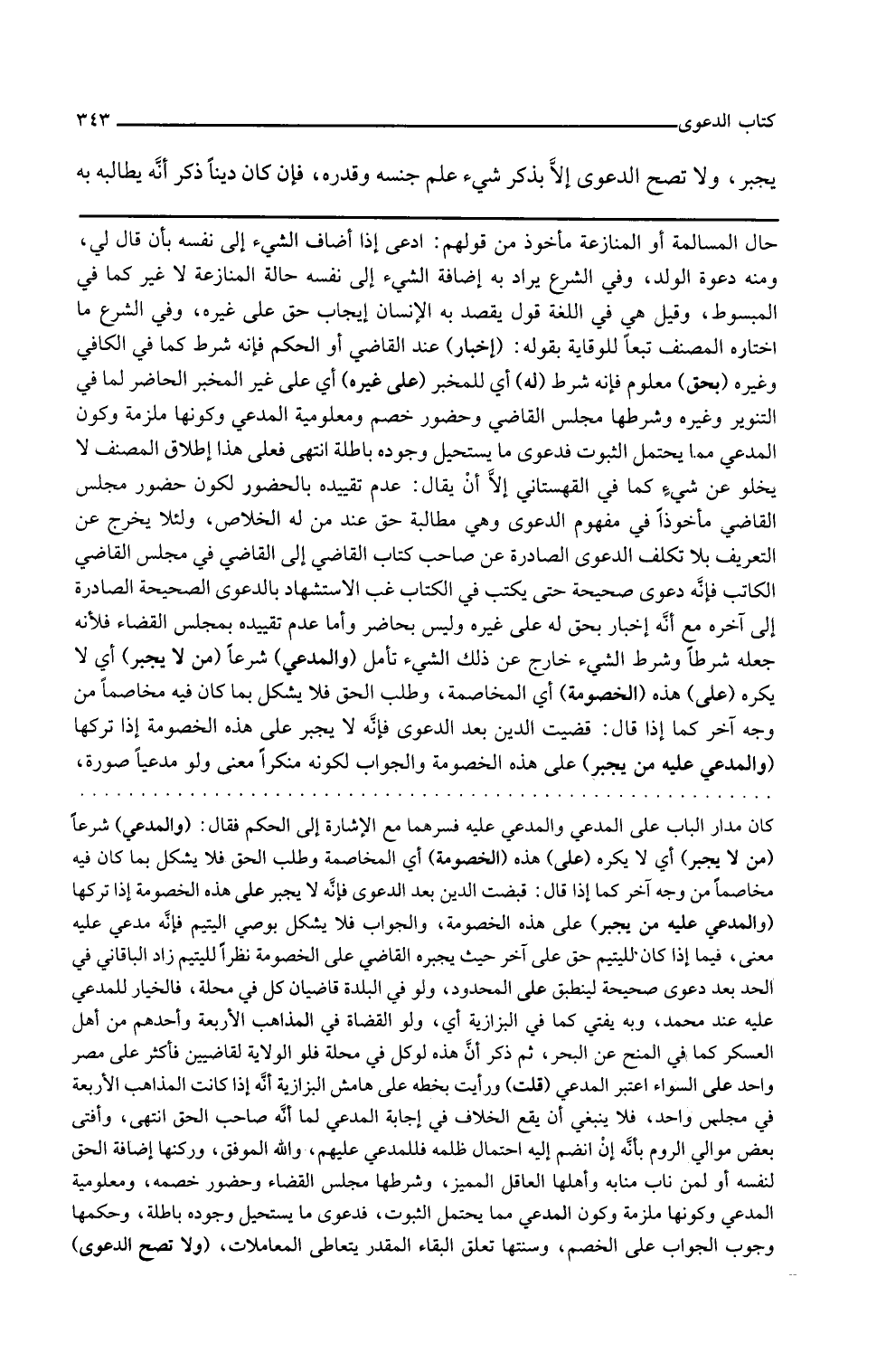 والمدعي شرعا من لا يجبر أي لا يكره على هذه الخصومة أي المخاصمة وطلب الحق فلا يشكل بما كان فيه مخاصما من وجه آخر كما إذا قال قضيت الدين بعد الدعوى فإنه لا يجبر على هذه الخصومة إذا تركها والمدعى عليه من يجبر على هذه الخصومة والجواب لكونه منكرا معنى ولو مدعيا صورة