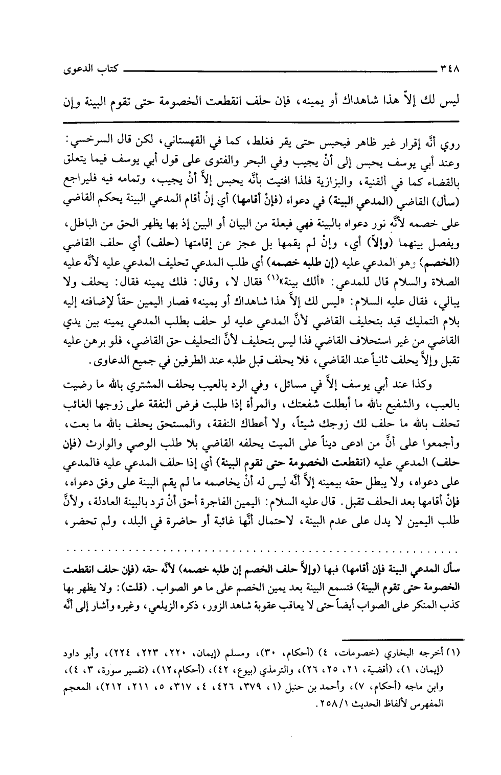 سأل القاضي المدعي البينة في دعواه فإن أقامها أي إن أقام المدعي البينة يحكم القاضي على خصمه لأنه نور دعواه بالبينة فهي فيعلة من البيان أو البين إذ بها يظهر الحق من الباطل ويفصل بينهما وإلا أي وإن لم يقمها بل عجز عن إقامتها حلف أي حلف القاضي الخصم وهو المدعى عليه إن طلبه خصمه أي طلب المدعي تحليف المدعى عليه لأنه عليه الصلاة والسلام قال للمدعي ألك بينة فقال لا وقال فلك يمينه فقال يحلف ولا يبالي فقال عليه السلام ليس لك إلا هذا شاهداك أو يمينه فصار اليمين حقا لإضافته إليه فاللام التمليك قيد بتحليف القاضي لأن المدعى عليه لو حلف بطلب المدعي يمينه بين يدي القاضي من غير استحلاف القاضي فذا ليس بتحليف لأن التحليف حق القاضي فلو برهن عليه تقبل وإلا يحلف ثانيا عند القاضي فلا يحلف قبل طلبه عند الطرفين في جميع الدعاوى وكذا عند أبي يوسف إلا في مسائل في الرد بالعيب يحلف المشتري بالله ما رضيت بالعيب والشفيع بالله ما أبطلت شفعتك والمرأة إذا طلبت فرض النفقة على زوجها الغائب تحلف بالله ما خلف لك زوجك شيئا ولا أعطاك النفقة والمستحق يحلف بالله ما بعت وأجمعوا على أن من ادعى دينا على الميت يحلفه القاضي بلا طلب الوصي والوارث فإن حلف المدعى عليه انقطعت الخصومة حتى تقوم البينة أي إذا حلف المدعى عليه فالمدعي على دعواه ولا يبطل حقه بيمينه إلا أنه ليس له أن يخاصمه ما لم يقم البينة على وفق دعواه فإن أقامها بعد الحلف تقبل قال عليه السلام اليمين الفاجرة أحق أن ترد بالبينة العادلة ولأن طلب اليمين لا يدل على عدم البينة لاحتمال أنها غائبة أو حاضرة في البلد ولم تحضر