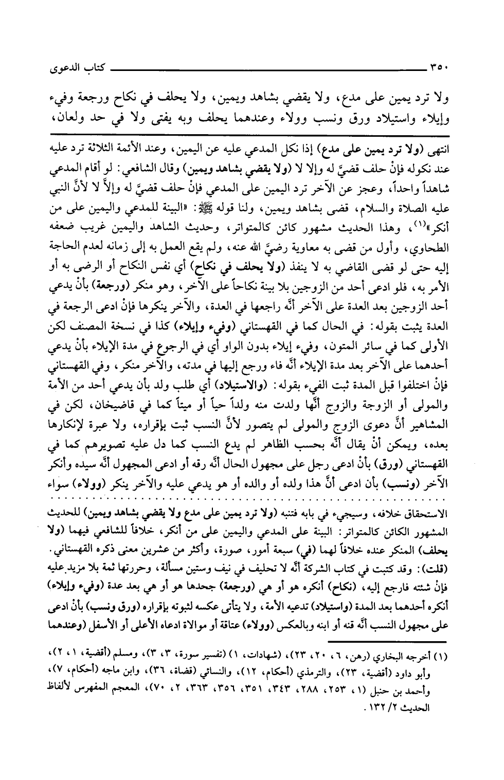 ولا يحلف في نكاح أي نفس النكاح أو الرضى به أو الأمر به فلو ادعى أحد من الزوجين بلا بينة نكاحا على الآخر وهو منكر ورجعة بأن يدعي أحد الزوجين بعد العدة على الآخر أنه راجعها في العدة والآخر ينكرها فإن ادعى الرجعة في العدة يثبت بقوله في الحال كما في القهستاني وفيء وإيلاء كذا في نسخة المصنف لكن الأولى كما في سائر المتون وفيء إيلاء بدون الواو أي في الرجوع في مدة الإيلاء بأن يدعي أحدهما على الآخر بعد مدة الإيلاء أنه فاء ورجع إليها في مدته والآخر منكر