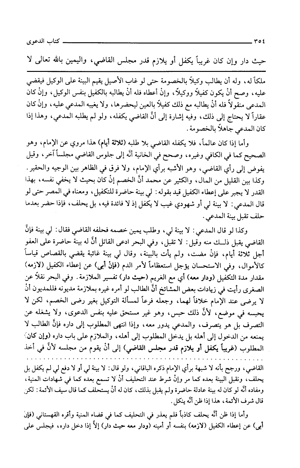 ملكا له وله أن يطالب وكيلا بالخصومة حتى لو غاب الأصيل يقيم البينة على الوكيل فيقضي عليه وصح أن يكون كفيلا ووكيلا وإن أعطاه فله أن يطالبه بالكفيل بنفس الوكيل وإن كان المدعى منقولا فله أن يطالبه مع ذلك كفيلا بالعين ليحضرها ولا يغيبه المدعى عليه وإن كان عقارا لا يحتاج إلى ذلك وفيه إشارة إلى أن القاضي يكفله ولو لم يطلبه المدعي وهذا إذا كان المدعي جاهلا بالخصومة وأما إذا كان عالما فلا يكفله القاضي بلا طلبه ثلاثة أيام هذا مروي عن الإمام وهو الصحيح كما في الكافي وغيره وصحح في الخانية أنه إلى جلوس القاضي مجلسا آخر وقيل يفوض إلى رأي القاضي وهو الأشبه برأي الإمام ولا فرق في الظاهر بين الوجيه والحقير وكذا بين القليل من المال والكثير عن محمد أن الخصم إن كان بحيث لا يخفي نفسه بهذا القدر لا يجبر على إعطاء الكفيل قيد بقوله لي بينة حاضرة للتكفيل ومعناه في المصر حتى لو قال المدعي لا بينة لي أو شهودي غيب لا يكفل إذ لا فائدة فيه بل يحلف فإذا حضر بعدما حلف نقبل بينة المدعي وكذا لو قال المدعي لا بينة لي وطلب يمين خصمه فحلفه القاضي فقال لي بينة فإن القاضي يقبل ذلك منه وقيل لا تقبل