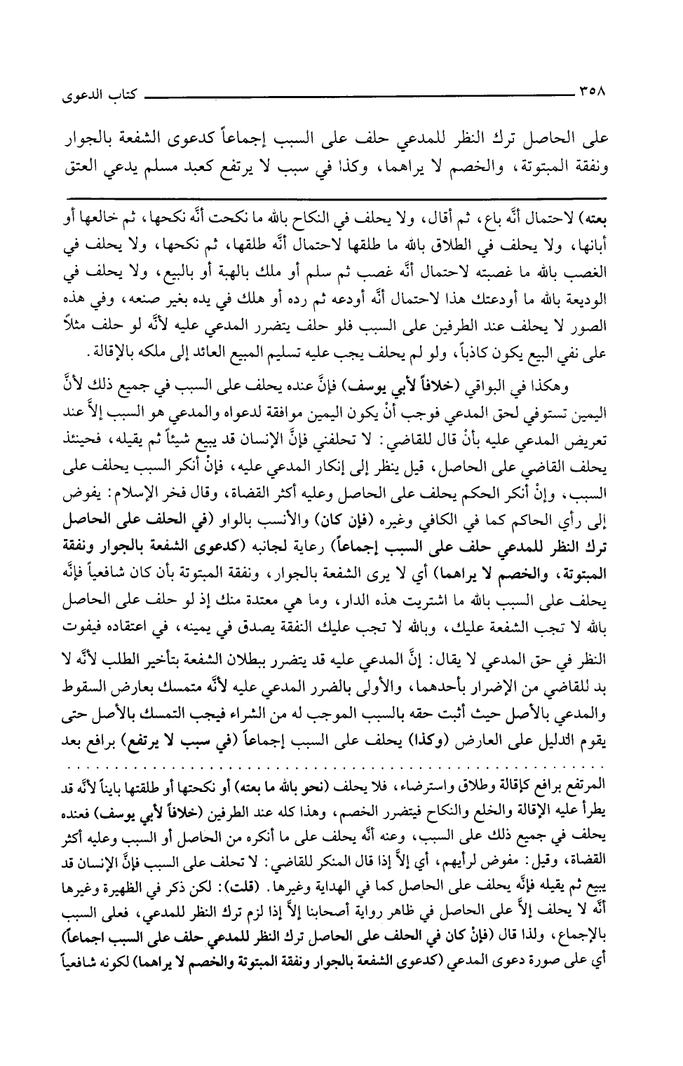 وقال فخر الإسلام يفوض إلى رأى الحاكم كما في الكافي وغيره فإن كان والأنسب بالواو في الحلف على الحاصل ترك النظر للمدعي حلف على السبب إجماعا رعاية لجانبه كدعوى الشفعة بالجوار ونفقة المبتوتة والخصم لا يراهما أي لا يرى الشفعة بالجوار ونفقة المبتوتة بأن كان شافعيا فإنه يحلف على السبب بالله ما اشتريت هذه الدار وما هي معتدة منك إذ لو حلف على الحاصل بالله لا تجب الشفعة عليك وبالله لا تجب عليك النفقة يصدق في يمينه في اعتقاده فيفوت النظر في حق المدعي لا يقال أن المدعى عليه قد يتضرر ببطلان الشفعة بتأخير الطلب لأنه لا بد للقاضي من الإضرار بأحدهما والأولى بالضرر المدعى عليه لأنه متمسك بعارض السقوط والمدعي بالأصل حيث أثبت حقه بالسبب الموجب له من الشراء فيجب التمسك بالأصل حتى يقوم الدليل على العارض
