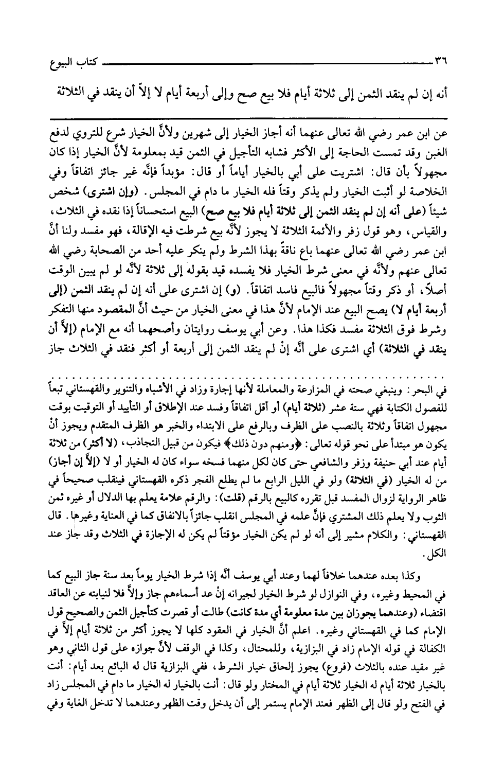 عن ابن عمر رضي الله تعالى عنهما أنه أجاز الخيار إلى شهرين ولأن الخيار شرع للتروي لدفع الغبن وقد تمست الحاجة إلى الأكثر فشابه التأجيل في الثمن قيد بمعلومة لأن الخيار إذا كان مجهولا بأن قال اشتريت على أني بالخيار أياما أو قال مؤبدا فإنه غير جائز اتفاقا