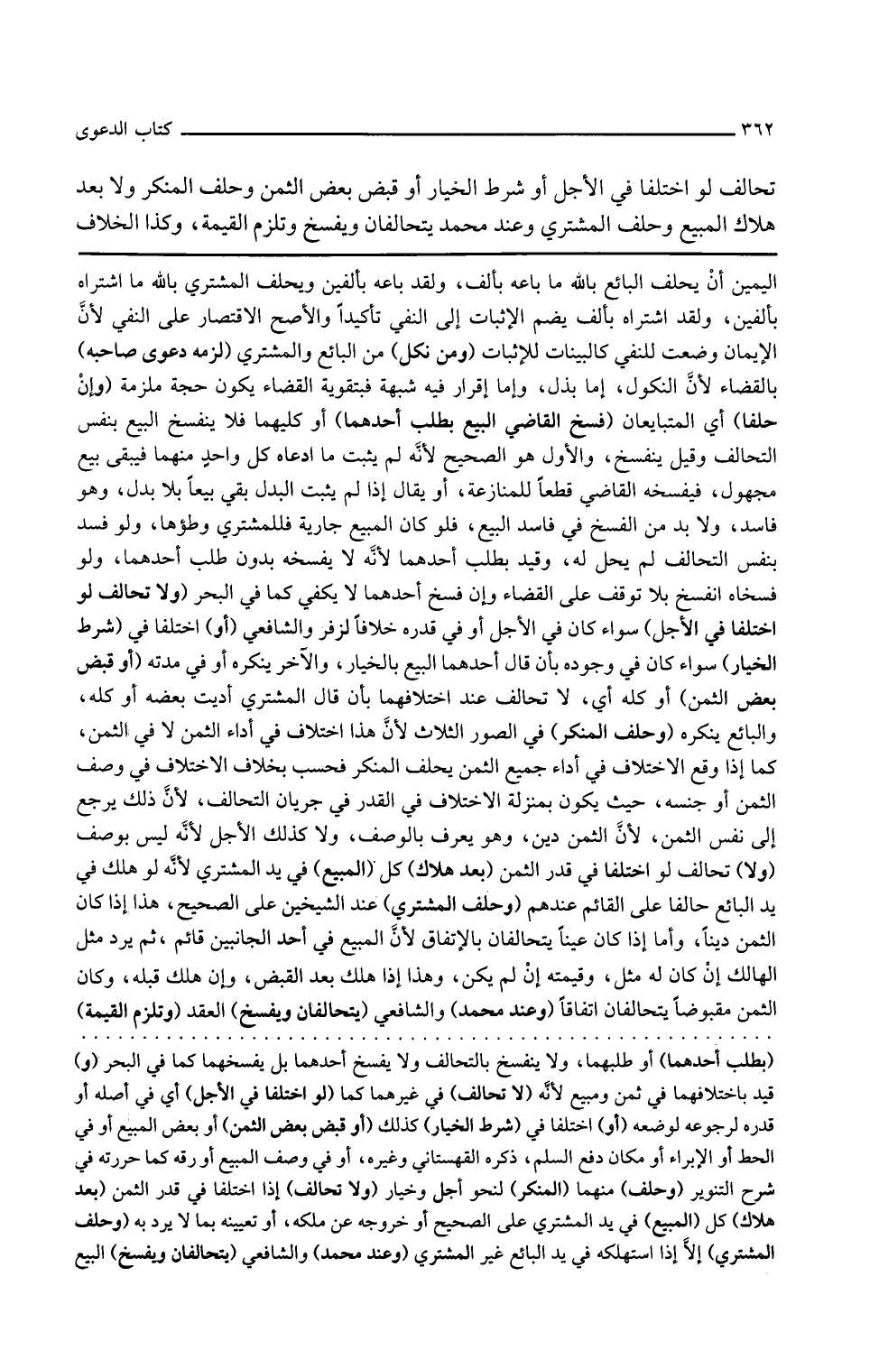 ولا تحالف لو اختلفا في الأجل سواء كان في الأجل أو في قدره خلافا لزفر والشافعي أو اختلفا في شرط الخيار سواء كان في وجوده بأن قال أحدهما البيع بالخيار والآخر ينكره أو في مدته أو قبض بعض الثمن أو كله أي لا تحالف عند اختلافهما بأن قال المشتري أديت بعضه أو كله والبائع ينكره وحلف المنكر في الصور الثلاث لأن هذا اختلاف في أداء الثمن لا في الثمن كما إذا وقع الاختلاف في أداء جميع الثمن يحلف المنكر فحسب بخلاف الاختلاف في وصف الثمن أو جنسه حيث يكون بمنزلة الاختلاف في القدر في جريان التحالف لأن ذلك يرجع إلى نفس الثمن لأن الثمن دين وهو يعرف بالوصف ولا كذلك الأجل لأنه ليس بوصف ولا تحالف لو اختلفا في قدر الثمن بعد هلاك كل المبيع في يد المشتري لأنه لو هلك في يد البائع تحالفا على القائم عندهم وحلف المشتري عند الشيخين على الصحيح هذا إذا كان الثمن دينا وأما إذا كان عينا يتحالفان بالاتفاق لأن المبيع في أحد الجانبين قائم ثم يرد مثل الهالك إن كان له مثل وقيمته إن لم يكن وهذا إذا هلك بعد القبض وإن هلك قبله وكان الثمن مقبوضا يتحالفان اتفاقا وعند محمد والشافعي يتحالفان ويفسخ العقد وتلزم القيمة