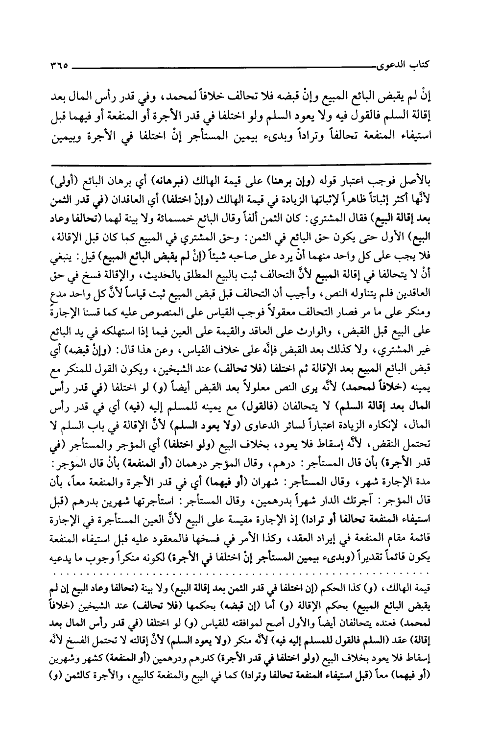 وإن قبضه أي قبض البائع المبيع بعد الإقالة ثم اختلفا فلا تحالف عند الشيخين ويكون القول للمنكر مع يمينه خلافا لمحمد لأنه يرى النص معلولا بعد القبض أيضا