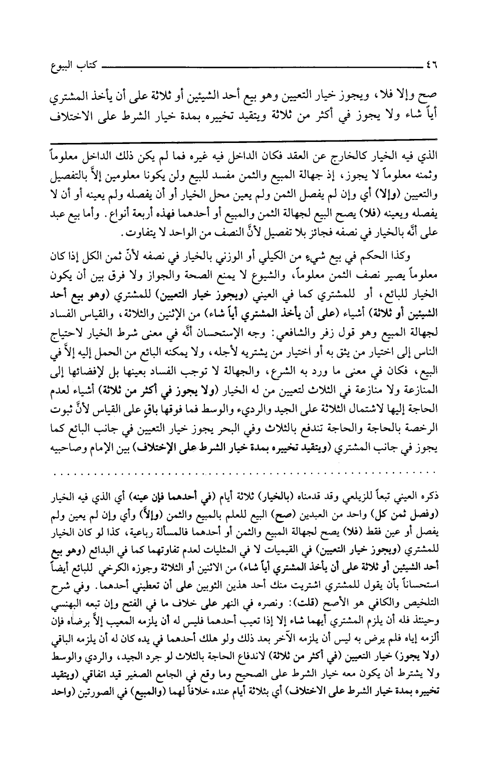 الذي فيه الخيار كالخارج عن العقد فكان الداخل فيه غيره فما لم يكن ذلك الداخل معلوما وثمنه معلوما لا يجوز إذ جهالة المبيع والثمن مفسد للبيع ولن يكونا معلومين إلا بالتفصيل والتعيين وإلا أي وإن لم يفصل الثمن ولم يعين محل الخيار أو أن يفصله ولم يعينه أو أن لا يفصله ويعينه فلا يصح البيع لجهالة الثمن والمبيع أو أحدهما فهذه أربعة أنواع وأما بيع عبد على أنه بالخيار في نصفه فجائز بلا تفصيل لأن النصف من الواحد لا يتفاوت وكذا الحكم في بيع شيء من الكيلي أو الوزني بالخيار في نصفه لأن ثمن الكل إذا كان معلوما يصير نصف الثمن معلوما والشيوع لا يمنع الصحة والجواز ولا فرق بين أن يكون الخيار للبائع أو للمشتري كما في العيني