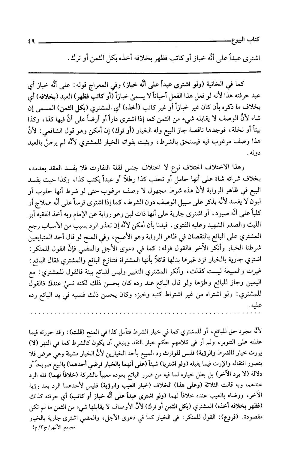 وفي المعراج قوله على أنه خباز أي عبد حرفته هذا لأنه لو فعل هذا الفعل أحيانا لا يسمى خبازا أو كاتب فظهر العبد بخلافه أي بخلاف ما ذكره بأن كان غير خباز أو غير كاتب أخذه أي المشتري بكل الثمن المسمى إن شاء لأن الوصف لا يقابله شيء من الثمن كما إذا اشترى دارا أو أرضا على أن فيها كذا وكذا بيتا أو نخلة فوجدها ناقصة جاز البيع وله الخيار أو ترك إن أمكن وهو قول الشافعي لأن هذا وصف مرغوب به فيستحق بالشرط ويثبت بفواته الخيار للمشتري لأنه لم يرض بالعبد دونه وهذا الاختلاف اختلاف نوع لا اختلاف جنس لقلة التفاوت فلا يفسد العقد بعدمه بخلاف شرائه شاة على أنها حامل أو تحلب كذا رطلا أو عبدا يكتب كذا وكذا حيث يفسد البيع في ظاهر الرواية لأن هذا شرط مجهول لا وصف مرغوب حتى لو شرط أنها حلوب أو لبون لا يفسد لأنه يذكر على سبيل الوصف دون الشرط كما إذا اشترى فرسا على أنه هملاج أو كلبا على أنه صيود أو اشترى جارية على أنها ذات لبن وهو رواية عن الإمام وبه أخذ الفقيه أبو الليث والصدر الشهيد وعليه الفتوى قيدنا بأن أمكن لأنه إن تعذر الرد بسبب من الأسباب رجع المشتري على البائع بالنقصان في ظاهر الرواية وهو الأصح