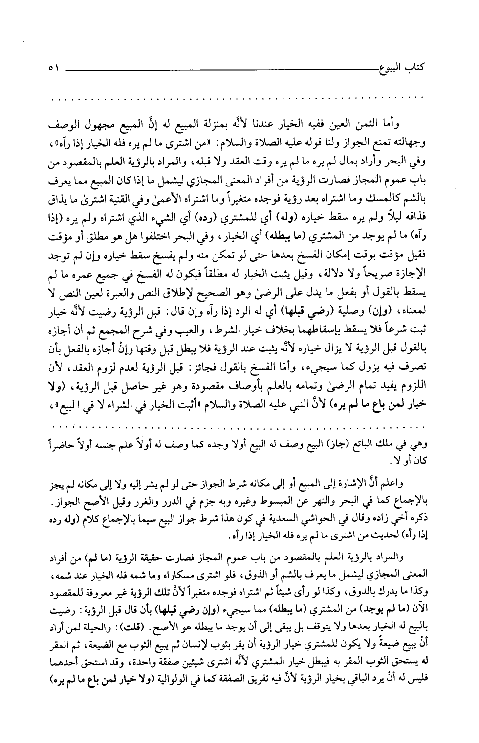 وفي البحر وأراد بما لم يره ما لم يره وقت العقد ولا قبله والمراد بالرؤية العلم بالمقصود من باب عموم المجاز فصارت الرؤية من أفراد المعنى المجازي ليشمل ما إذا كان المبيع مما يعرف بالشم كالمسك وما اشتراه بعد رؤية فوجده متغيرا وما اشتراه الأعمى وفي القنية اشترى ما يذاق فذاقه ليلا ولم يره سقط خياره وله أي للمشتري رده أي الشيء الذي اشتراه ولم يره إذا رآه ما لم يوجد من المشتري ما يبطله أي الخيار وفي البحر اختلفوا هل هو مطلق أو مؤقت فقيل مؤقت بوقت إمكان الفسخ بعدها حتى لو تمكن منه ولم يفسخ سقط خياره وإن لم توجد الإجازة صريحا ولا دلالة وقيل يثبت الخيار له مطلقا فيكون له الفسخ في جميع عمره ما لم يسقط بالقول أو بفعل ما يدل على الرضى وهو الصحيح لإطلاق النص والعبرة لعين النص لا لمعناه