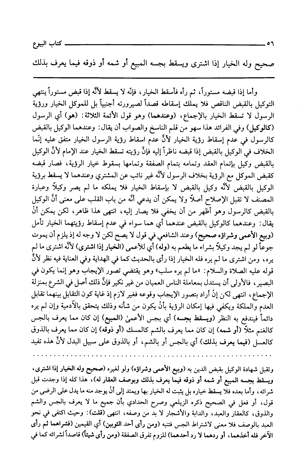 وفي العناية فيه نظر لأن قوله عليه الصلاة والسلام ما لم يره سلب وهو يقتضي تصور الإيجاب وهو إنما يكون في البصير فالأولى أن يستدل بمعاملة الناس العميان من غير نكير فإن ذلك أصل في الشرع بمنزلة الإجماع انتهى لكن إن أراد بتصور الإيجاب وقوعه فغير لازم إذ غاية كون التقابل بينهما تقابل العدم والملكة ويكفي فيها إمكان الرؤية بأن يكون من شأنه وذلك يتحقق بالآدمية وإن لم يره دائما فيندفع به النظر ويسقط بجسه أي بجس الأعمى المبيع إن كان مما يعرف بالجس كالغنم مثلا أو شمه إن كان مما يعرف بالشم كالمسك أو ذوقه إن كان مما يعرف بالذوق كالعسل فيما يعرف بذلك أي بالجس أو بالشم أو بالذوق على سبيل البدل لأن هذه تفيد