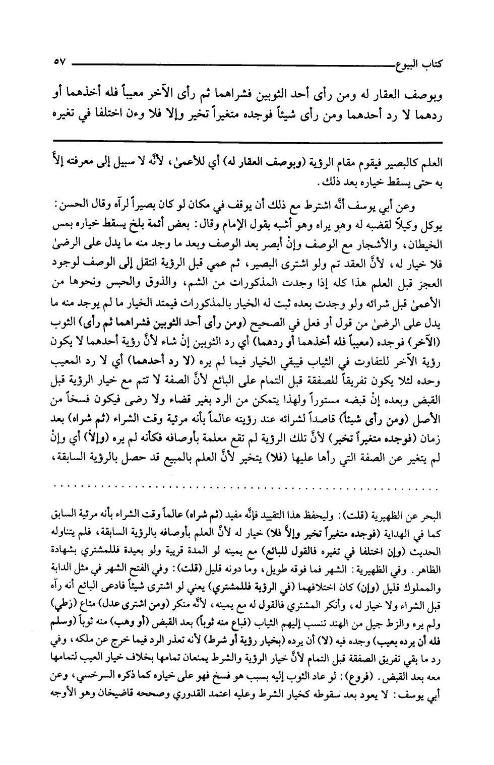 ومن رأى شيئا قاصدا لشرائه عند رؤيته عالما بأنه مرئية وقت الشراء ثم شراه بعد زمان فوجده متغيرا تخير لأن تلك الرؤية لم تقع معلمة بأوصافه فكأنه لم يره وإلا أي وإن لم يتغير عن الصفة التي رآها عليها فلا يتخير لأن العلم بالمبيع قد حصل بالرؤية السابقة