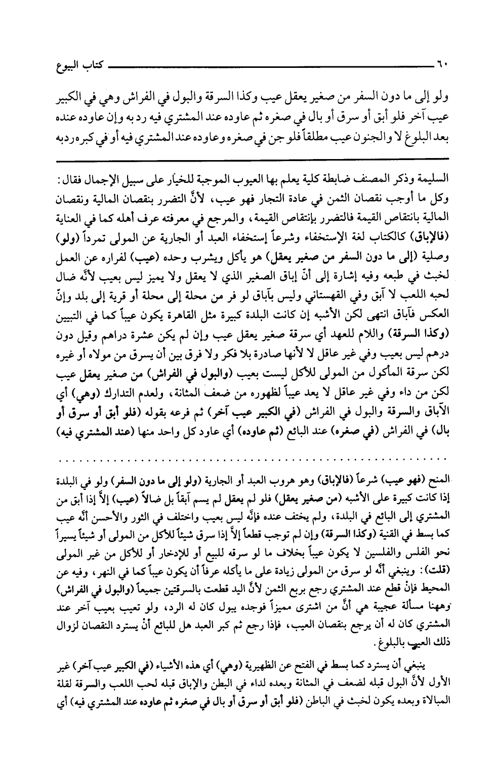 وكذا السرقة واللام للعهد أي سرقة صغير يعقل عيب وإن لم يكن عشرة دراهم وقيل دون درهم ليس بعيب وفي غير عاقل لا لأنها صادرة بلا فكر ولا فرق بين أن يسرق من مولاه أو غيره لكن سرقة المأكول من المولى للأكل ليست بعيب والبول في الفراش من صغير يعقل عيب لكن من داء وفي غير عاقل لا يعد عيبا لظهوره من ضعف المثانة ولعدم التدارك وهي أي الإباق والسرقة والبول في الفراش في الكبير عيب آخر ثم فرعه بقوله فلو أبق أو سرق أو بال في الفراش في صغره عند البائع ثم عاوده أي عاود كل واحد منها عند المشتري فيه