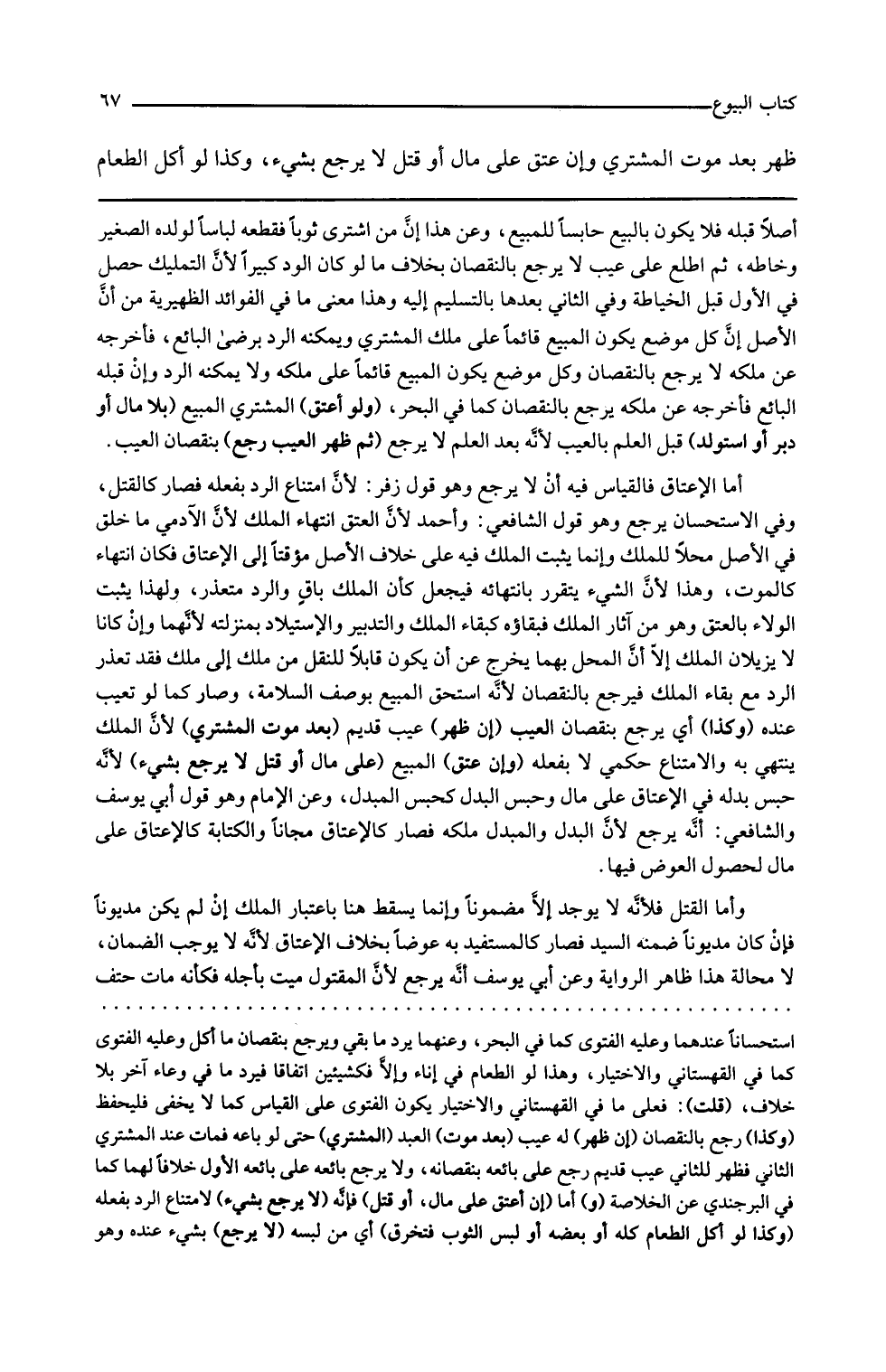 ولو أعتق المشتري المبيع بلا مال أو دبر أو استولد قبل العلم بالعيب لأنه بعد العلم لا يرجع ثم ظهر العيب رجع بنقصان العيب أما الإعتاق فالقياس فيه أن لا يرجع وهو قول زفر لأن امتناع الرد بفعله فصار كالقتل