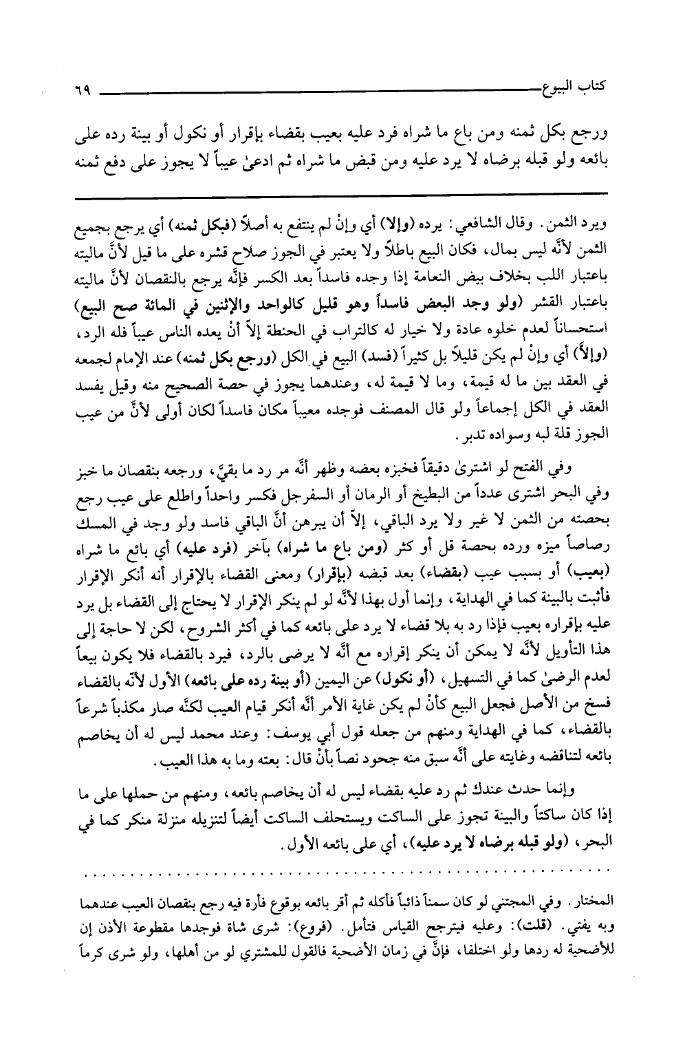 ومن باع ما شراه بآخر فرد عليه أي بائع ما شراه بعيب أو بسبب عيب بقضاء بعد قبضه بإقرار ومعنى القضاء بالإقرار أنه أنكر الإقرار فأثبت بالبينة كما في الهداية وإنما أول بهذا لأنه لو لم ينكر الإقرار لا يحتاج إلى القضاء بل يرد عليه بإقراره بعيب فإذا رد به بلا قضاء لا يرد على بائعه كما في أكثر الشروح لكن لا حاجة إلى هذا التأويل لأنه لا يمكن أن ينكر إقراره مع أنه لا يرضى بالرد فيرد بالقضاء فلا يكون بيعا لعدم الرضى كما في التسهيل أو نكول عن اليمين أو بينة رده على بائعه الأول لأنه بالقضاء فسخ من الأصل فجعل البيع كأن لم يكن غاية الأمر أنه أنكر قيام العيب لكنه صار مكذبا شرعا بالقضاء كما في الهداية ومنهم من جعله قول أبي يوسف