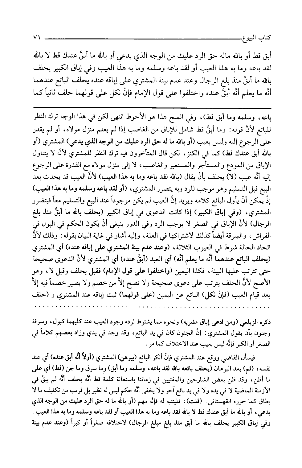 وفي المنح هذا هو الأحوط انتهى لكن في هذا الوجه ترك النظر للبائع لأن قوله وما أبق قط شامل للإباق من الغاصب إذا لم يعلم منزل مولاه أو لم يقدر على الرجوع إليه وليس بعيب أو بالله ماله حق الرد عليك من الوجه الذي يدعي المشتري أو بالله ما أبق عندك قط كما في الكنز لكن قال المتأخرون فيه ترك النظر للمشتري لأنه لا يتناول الإباق من المودع والمستأجر والمستعير والغاصب لا إلى منزل مولاه مع القدرة على الرجوع إليه أنه عيب لا يحلف بأن يقال بالله لقد باعه وما به هذا العيب لأن العيب قد يحدث بعد البيع قبل التسليم وهو موجب للرد وبه يتضرر المشتري أو لقد باعه وسلمه وما به هذا العيب إذ يمكن أن يؤول البائع كلامه ويريد أن العيب لم يكن موجودا عند البيع والتسليم معا فيتضرر المشتري وفي إباق الكبير إذا كانت الدعوى في إباق الكبير يحلف بالله ما أبق منذ بلغ الرجال لأن الإباق في الصغر لا يوجب الرد