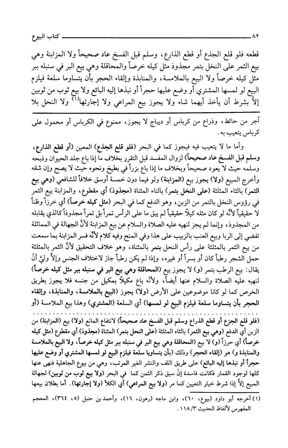وفي المنح وفيه كلام لأنه فسر المزابنة بما سمعت من بيع الثمر بالمثلثة على رأس النخل بتمر بالمثناة وهو خلاف التحقيق لأن الثمر بالمثلثة حمل الشجر رطبا كان أو بسرا أو غيره وإذا لم يكن رطبا جاز لاختلاف الجنس والأولى أن يقال بيع الرطب بتمر