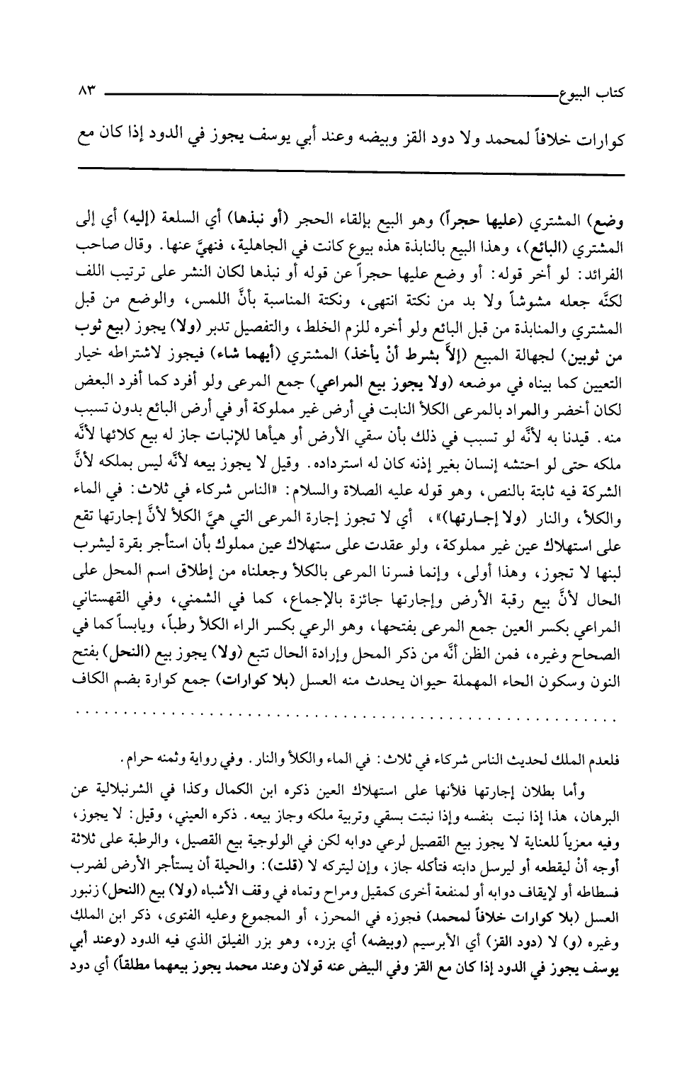 ولا يجوز بيع المراعي جمع المرعى ولو أفرد كما أفرد البعض لكان أخصر والمراد بالمرعى الكلأ النابت في أرض غير مملوكة أو في أرض البائع بدون تسبب منه قيدنا به لأنه لو تسبب في ذلك بأن سقى الأرض أو هيأها للإنبات جاز له بيع كلئها لأنه ملكه حتى لو احتشه إنسان بغير إذنه كان له استرداده وقيل لا يجوز بيعه لأنه ليس بملكه لأن الشركة فيه ثابتة بالنص وهو قوله عليه الصلاة والسلام الناس شركاء في ثلاث في الماء والكلأ والنار ولا إجارتها أي لا تجوز إجارة المرعى التي هي الكلأ لأن إجارتها تقع على استهلاك عين غير مملوكة ولو عقدت على استهلاك عين مملوك بأن استأجر بقرة ليشرب لبنها لا تجوز وهذا أولى وإنما فسرنا المرعى بالكلأ وجعلناه من إطلاق اسم المحل على الحال لأن بيع رقبة الأرض وإجارتها جائزة بالإجماع كما في الشمني وفي القهستاني المراعي بكسر العين جمع المرعى بفتحها وهو الرعي بكسر الراء الكلأ رطبا ويابسا كما في الصحاح وغيره فمن الظن أنه من ذكر المحل وإرادة الحال تتبع