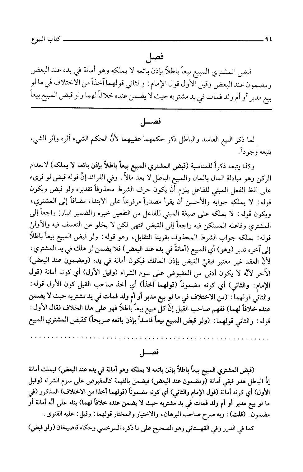 وفي الفرائد إن قوله قبض لو قرئ على لفظ الفعل المبني للفاعل يلزم أن يكون حرف الشرط محذوفا تقديره ولو قبض ويكون قوله لا يملكه جوابه والأحسن أن يقرأ مصدرا مرفوعا على الابتداء مضافا إلى المشتري ويكون قوله لا يملكه على صيغة المبني للفاعل من التفعيل خبره والضمير البارز راجعا إلى المشتري وفاعله المستكن فيه راجعا إلى القبض انتهى لكن لا يخلو عن التعسف فيه والأولى قوله يملكه جواب الشرط المحذوف بقرينة التقابل وهو قوله ولا قبض المبيع بيعا باطلا إلى آخره تدبر وهو أي المبيع أمانة في يده عند البعض فلا يضمن لو هلك في يد المشتري لأن العقد غير معتبر فبقي القبض بإذن المالك فيكون أمانة في يده ومضمون عند البعض الآخر لأنه لا يكون أدنى من المقبوض على سوم الشراء وقيل الأول أي كونه أمانة قول الإمام والثاني أي كونه مضمونا قولهما أخذا أي أخذ صاحب القيل كون الأول قوله والثاني قولهما من الاختلاف في ما لو بيع مدبر أو أم ولد فمات في يد مشتريه حيث لا يضمن عنده خلافا لهما ففهم صاحب القيل أن كل مبيع بيعا باطلا فهو على هذا الخلاف فقال الأول قوله والثاني قولهما