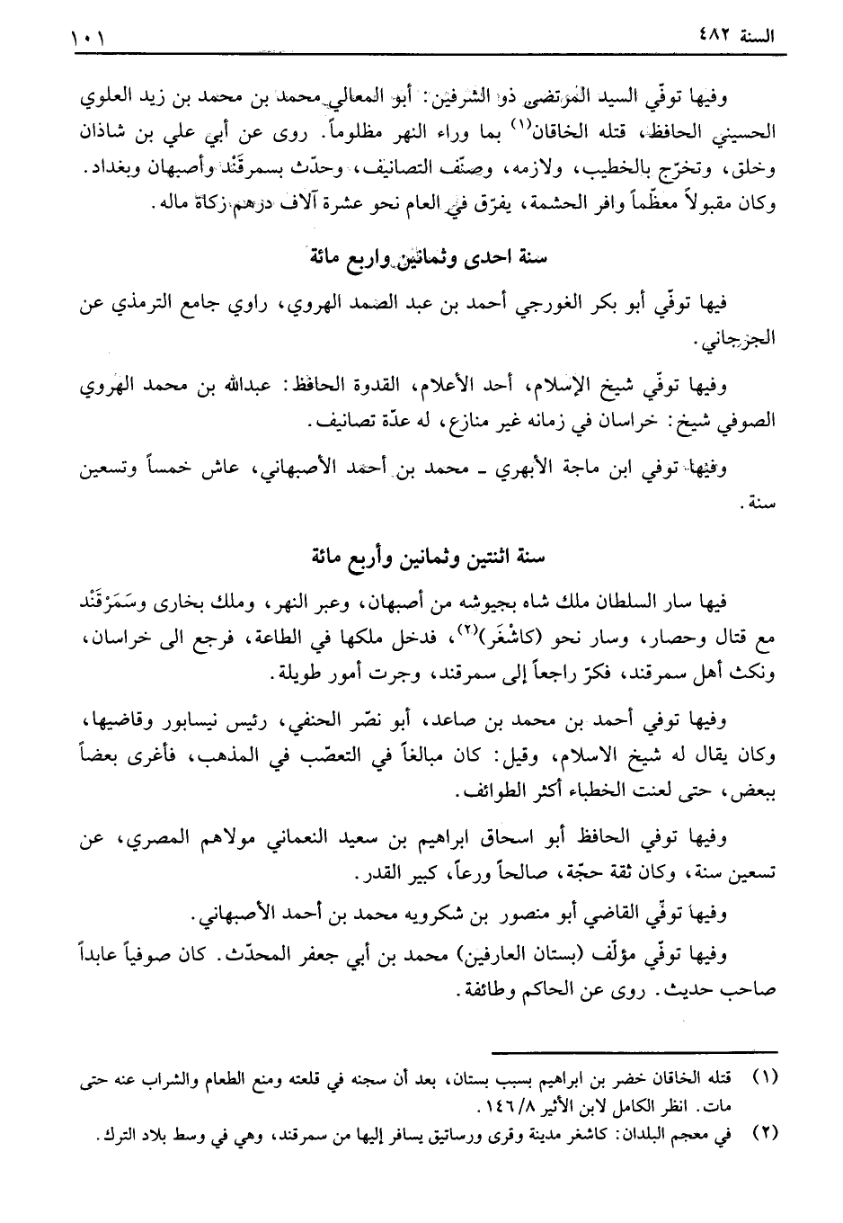 فيها سار السلطان ملك شاه بجيوشه من أصبهان، وعبر النهر، وملك بخارى وسمرقند مع قتال وحصار، وسار نحو كاشغر، فدخل ملكها في الطاعة، فرجع الى خراسان، ونكث أهل سمرقند، فكر راجعاً إلى سمرقند، وجرت أمور طويلة. وفيها توفي أحمد بن محمد بن صاعد، أبو نضر الحنفي، رئيس نيسابور وقاضيها، وكان يقال له شيخ الاسلام، وقيل: كان مبالغاً في التعصب في المذهب، فأغرى بعضاً ببعض، حتى لعنت الخطباء اكثر الطوائف. وفيها توفي الحافظ أبو اسحاق ابراهيم بن سعيد النعماني مولاهم المصري، عن تسعين سنة، وكان ثقة حجة، صالحاً ورعاً، كبير القدر. وفيها توفي القاضي أبو منصور بن شكرويه محمد بن أحمد الأصبهاني. وفيها توفي مؤلف بستان العارفين محمد بن أبي جعفر المحدث. كان صوفياً عابداً صاحب حديث. روى عن الحاكم وطائفة.