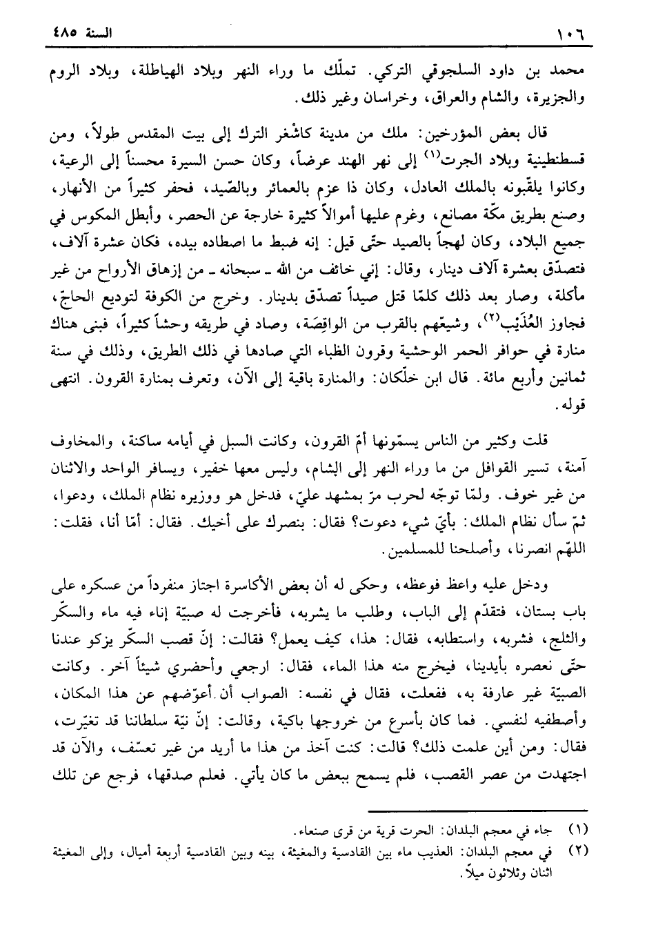 محمد بن داود السلجوقي التركي. تملك ما وراء النهر وبلاد الهياطلة، وبلاد الروم والجزيرة، والشام والعراق، وخراسان وغير ذلك. قال بعض المؤرخين: ملك من مدينة كاشغر الترك إلى بيت المقدس طولاً، ومن قسطنطينية وبلاد الجرت إلى نهر الهند عرضاً، وكان حسن السيرة محسناً إلى الرعية، وكانوا يلقبونه بالملك العادل، وكان ذا عزم بالعمائر وبالصيد، فحفر كثيراً من الأنهار، وصنع بطريق مكة مصانع، وغرم عليها أموالاً كثيرة خارجة عن الحصر، وأبطل المكوس في جميع البلاد، وكان لهجاً بالصيد حتى قيل: إنه ضبط ما اصطاده بيده، فكان عشرة آلاف، فتصذق بعشرة آلاف دينار، وقال: إني خائف من الله - سبحانه - من إزهاق الأرواح من غير مأكلة، وصار بعد ذلك كلما قتل صيداً تصدق بدينار. وخرج من الكوفة لتوديع الحاج، فجاوز العذي، وشيعهم بالقرب من الواقصة، وصاد في طريقه وحشاً كثيراً، فبنى هناك منارة في حوافر الحمر الوحشية وقرون الظباء التي صادها في ذلك الطريق، وذلك في سنة ثمانين وأربع مائة. قالى ابن خلكان: والمنارة باقية إلى الآن، وتعرف بمنارة القرون. انتهى قوله. قلت وكثير من الناس يسمونها أم القرون، وكانت السبل في أيامه ساكنة، والمخاوف آمنة، تسير القوافل من ما وراء النهر إلى الشام، وليس معها خفير، ويسافر الواحد والاثنان من غير خوف. ولما توجه لحرب مر بمشهد علي، فدخل هو ووزيره نظام الملك، ودعوا، ثم سأل نظام الملك: بأي شيء دعوت؟ فقال: بنصرك على أخيك. فقال: أما أنا، فقلت: اللهم انصرنا، وأصلحنا للمسلمين. ودخل عليه واعظ فوعظه، وحكى له أن بعض الأكاسرة اجتاز منفرداً من عسكره على باب بستان، فتقدم إلى الباب، وطلب ما يشربه، فأخرجت له صبية إناء فيه ماء والسكر والثلج، فشربه، واستطابه، فقال: هذا، كيف يعمل؟ فقالت: إن قصب السكر يزكو عندنا حتى نعصره بأيدينا، فيخرج منه هذا الماء، فقال: ارجعي وأحضري شيئاً آخر. وكانت الصبية غير عارفة به، ففعلت، فقال في نفسه: الصواب أن أعوضهم عن هذا المكان، وأصطفيه لنفسي. فما كان بأسرع من خروجها باكية، وقالت: إن نتة سلطاننا قد تغيرت، فقال: ومن أين علمت ذلك؟ قالت: كنت آخذ من هذا ما أريد من غير تعسف، والآن قد اجتهدت من عصر القصب، فلم يسمح ببعض ما كان يأتي. فعلم صدقها، فرجع عن تلك