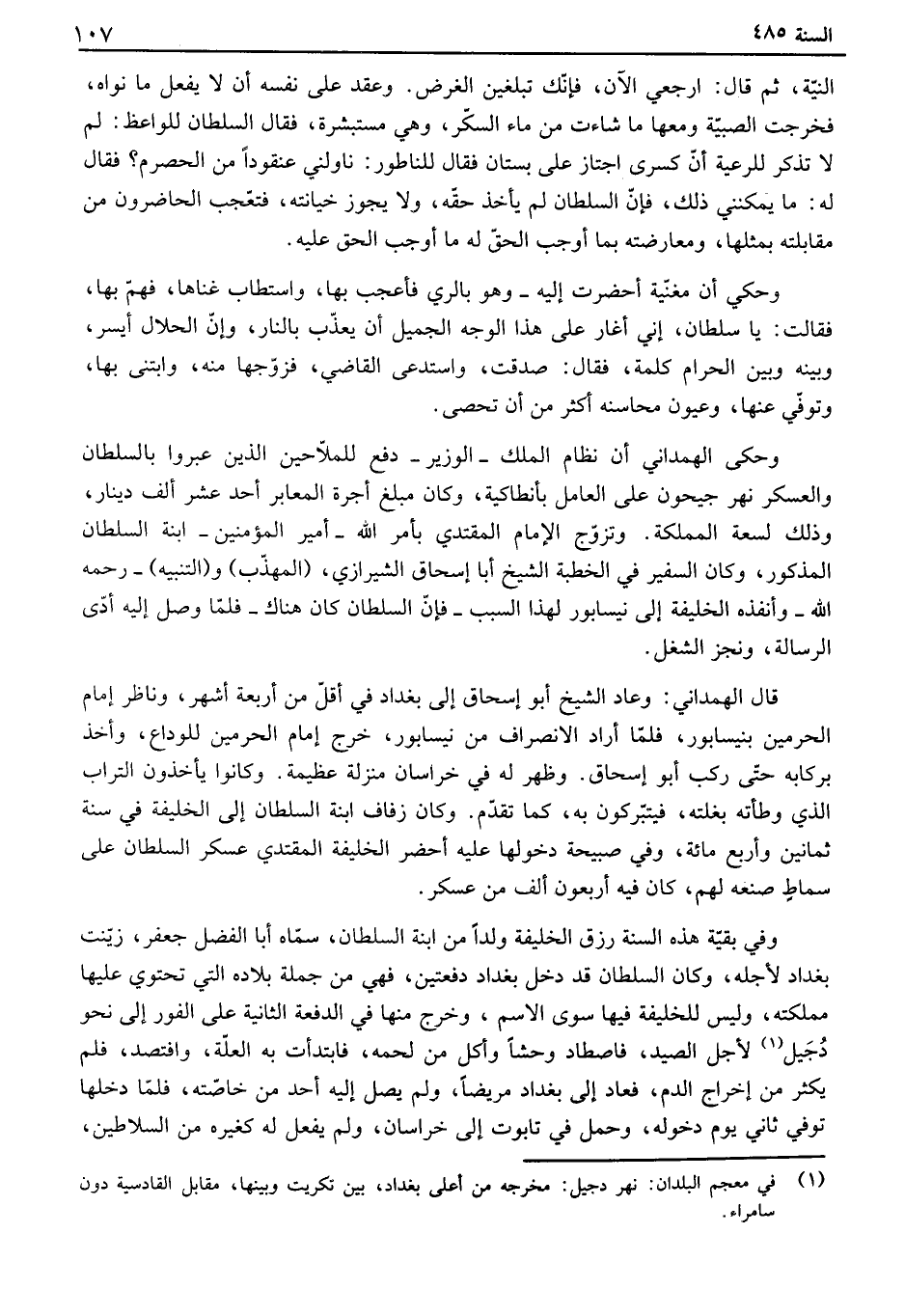 الهمداني: وعاد الشيخ أبو إسحاق إلى بغداد في أقل من أربعة أشهر، وناظر إمام الحرمين بنيسابور، فلما أراد الانصراف من نيسابور، خرج إمام الحرمين للوداع، وأخذ بركابه حتى ركب أبو إسحاق. وظهر له في خراسان منزلة عظيمة. وكانوا يأخذون التراب الذي وطأته بغلته، فيتبركون به، كما تقدم. وكان زفاف ابنة السلطان إلى الخليفة في سنة ثمانين وأربع مائة، وفي صبيحة دخولها عليه أحضر الخليفة المقتدي عسكر السلطان على سماط صنعه لهم، كان فيه أربعون ألف من عسكر. وفي بقية هذه السنة رزق الخليفة ولداً من ابنة السلطان، سماه أبا الفضل جعفر، زينت بغداد لأجله، وكان السلطان قد دخل بغداد دفعتين، فهي من جملة بلاده التي تحتوي عليها مملكته، وليس للخليفة فيها سوى الاسم، وخرج منها في الدفعة الثانية على الفور إلى نحو دجيل لأجل الصيد، فاصطاد وحشاً وأكل من لحمه، فابتدأت به العلة، وافتصد، فلم يكثر من إخراج الدم، فعاد إلى بغداد مريضاً، ولم يصل إليه أحد من خاصته، فلما دخلها توفي ثاني يوم دخوله، وحمل في تابوت إلى خراسان، ولم يفعل له كغيره من السلاطين، فلم يشهد له جنازة، ولا صلى عليه أحد ظاهراً، ولا جر ذنب فرس من أجل موته. ني: وعاد الشيخ أبو إسحاق إلى بغداد في أقل من أربعة أشهر، وناظر إمام الحرمين بنيسابور، فلما أراد الانصراف من نيسابور، خرج إمام الحرمين للوداع، وأخذ بركابه حتى ركب أبو إسحاق. وظهر له في خراسان منزلة عظيمة. وكانوا يأخذون التراب الذي وطأته بغلته، فيتبركون به، كما تقدم. وكان زفاف ابنة السلطان إلى الخليفة في سنة ثمانين وأربع مائة، وفي صبيحة دخولها عليه أحضر الخليفة المقتدي عسكر السلطان على سماط صنعه لهم، كان فيه أربعون ألف من عسكر. وفي بقية هذه السنة رزق الخليفة ولداً من ابنة السلطان، سماه أبا الفضل جعفر، زينت بغداد لأجله، وكان السلطان قد دخل بغداد دفعتين، فهي من جملة بلاده التي تحتوي عليها مملكته، وليس للخليفة فيها سوى الاسم، وخرج منها في الدفعة الثانية على الفور إلى نحو دجيل لأجل الصيد، فاصطاد وحشاً وأكل من لحمه، فابتدأت به العلة، وافتصد، فلم يكثر من إخراج الدم، فعاد إلى بغداد مريضاً، ولم يصل إليه أحد من خاصته، فلما دخلها توفي ثاني يوم دخوله، وحمل في تابوت إلى خراسان، ولم يفعل له كغيره من السلاطين،