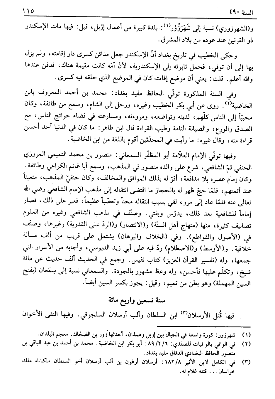 بها إلى أن توفي، فحمل تابوته إلى الإسكندرية، لأن أمه كانت مقيمة هناك، فدفن عندها والله أعلم. قلت: يعني أن موضع إقامته كان في الموضع الذي خلقه فيه كسرى. وفي السنة المذكورة توفي الحافظ مفيد بغداد: محمد بن أحمد المعروف بابن الخاضبة. روى عن أبي بكر الخطيب وغيره، ورحل إلى الشام، وسمع من طائفة، وكان محبباً إلى الناس كلهم، لدينه وتواضعه، ومروءته، ومسارعته في قضاء حوائج الناس، مع الصدق والورع، والصيانة التامة وطيب القراءة قال ابن طاهر: ما كان في الدنيا أحد أحسن قراءة منه، وقال غيره: ما رأيت في المحدثين أقوم باللغة من ابن الخاضبة. وفيها توفي الإمام العلامة أبو المظفر السمعاني: منصور بن محمد التميمي المروزي الحنفي ثم الشافعي، شرع على والده منصور في المذهب، وسمع أبا غانم الكراعي وطائفة، وكان إمام عصره بلا مدافعة، أقر له بذلك الموافق والمخالف، وكان حنفي المذهب، متعيناً عند أئمتهم، فلما حج ظهر له بالحجاز ما اقتضى انتقاله إلى مذهب الإمام الشافعي رضي الله تعالى عنه فلما عاد إلى مرو، لقي بسبب انتقاله محناً وتعصباً عظيماً، فعبر على ذلك، فصار إماماً للشافعية بعد ذلك، يدرس ويفتي. وصنف في مذهب الشافعي وغيره من العلوم تصانيف كثيرة، منها منهاج أهل السنة والانتصار والرد على القدرية وغيرها، وصنف في الأصول والقواطع. وفي الخلاف والبرهان يشتمل على قريب من ألف مسألة خلافية. والأوسط والاصطلام رد فيه على أبي زيد الدبوسي، وأجابه من الأسرار التي جمعها، وله تفسير القرآن العزيز كتاب نفيس. وجمع في الحديث ألف حديث عن مائة شيخ، وتكلم عليها فأحسن، وله وعظ مشهور بالجودة. والسمعاني نسبة إلى سمعان بفتح السين المهملة وهو بطن من تميم، وقيل: يجوز بكسر السين أيضاً.