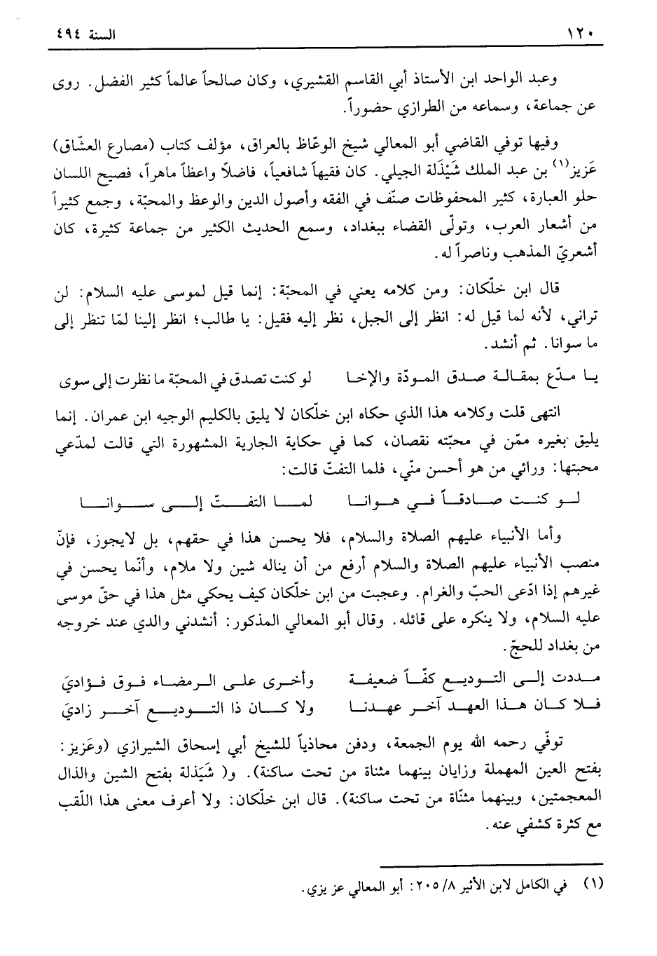 وعبد الواحد ابن الأستاذ أبي القاسم القشيري، وكان صالحاً عالماً كثير الفضل. روى عن جماعة، وسماعه من الطرازي حضوراً. وفيها توفي القاضي أبو المعالي شيخ الوعاظ بالعراق، مؤلف كتاب مصارع العشاق عزيز بن عبد الملك شيذلة الجيلي. كان فقيهاً شافعياً، فاضلاً واعظاً ماهراً، فصيح اللسان حلو العبارة، كثير المحفوظات صنف في الفقه وأصول الدين والوعظ والمحبة، وجمع كثيراً من أشعار العرب، وتولى القضاء ببغداد، وسمع الحديث الكثير من جماعة كثيرة، كان أشعري المذهب وناصراً له. قال ابن خلكان: ومن كلامه يعني في المحبة: إنما قيل لموسى عليه السلام: لن تراني، لأنه لما قيل له: انظر إلى الجبل، نظر إليه فقيل: يا طالب؛ انظر إلينا لما تنظر إلى ما سوانا. ثم أنشد.