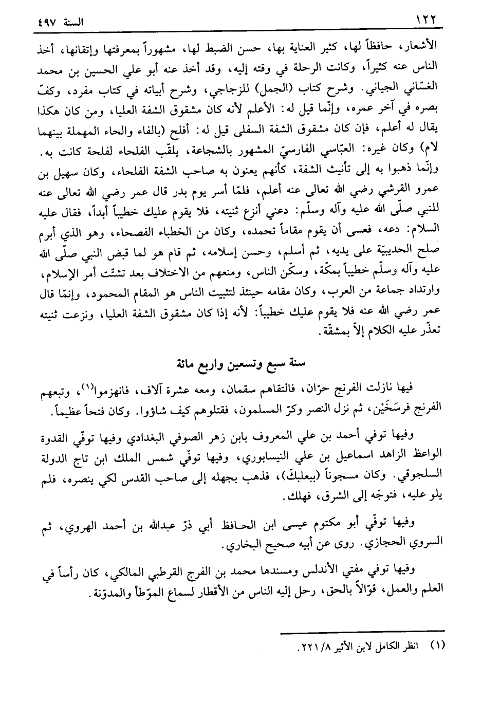فيها نازلت الفرنج حران، فالتقاهم سقمان، ومعه عشرة آلاف، فانهزموا، وتبعهم الفرنج فرسخين، ثم نزل النصر وكر المسلمون، فقتلوهم كيف شاؤوا. وكان فتحاً عظيماً. وفيها توفي أحمد بن علي المعروف بابن زهر الصوفي البغدادي وفيها توفي القدوة الواعظ الزاهد اسماعيل بن علي النيسابوري، وفيها توفي شمس الملك ابن تاج الدولة السلجوقي. وكان مسجوناً ببعلبك، فذهب بجهله إلى صاحب القدس لكي ينصره، فلم يلو عليه، فتوجه إلى الشرق، فهلك. وفيها توفي أبو مكتوم عيسى ابن الحافظ أبي ذر عبد الله بن أحمد الهروي، ثم السروي الحجازي. روى عن أبيه صحيح البخاري. وفيها توفي مفتي الأندلس ومسندها محمد بن الفرج القرطبي المالكي، كان رأساً في العلم والعمل، قوالاً بالحق، رحل إليه الناس من الأقطار لسماع الموطأ والمدونة.