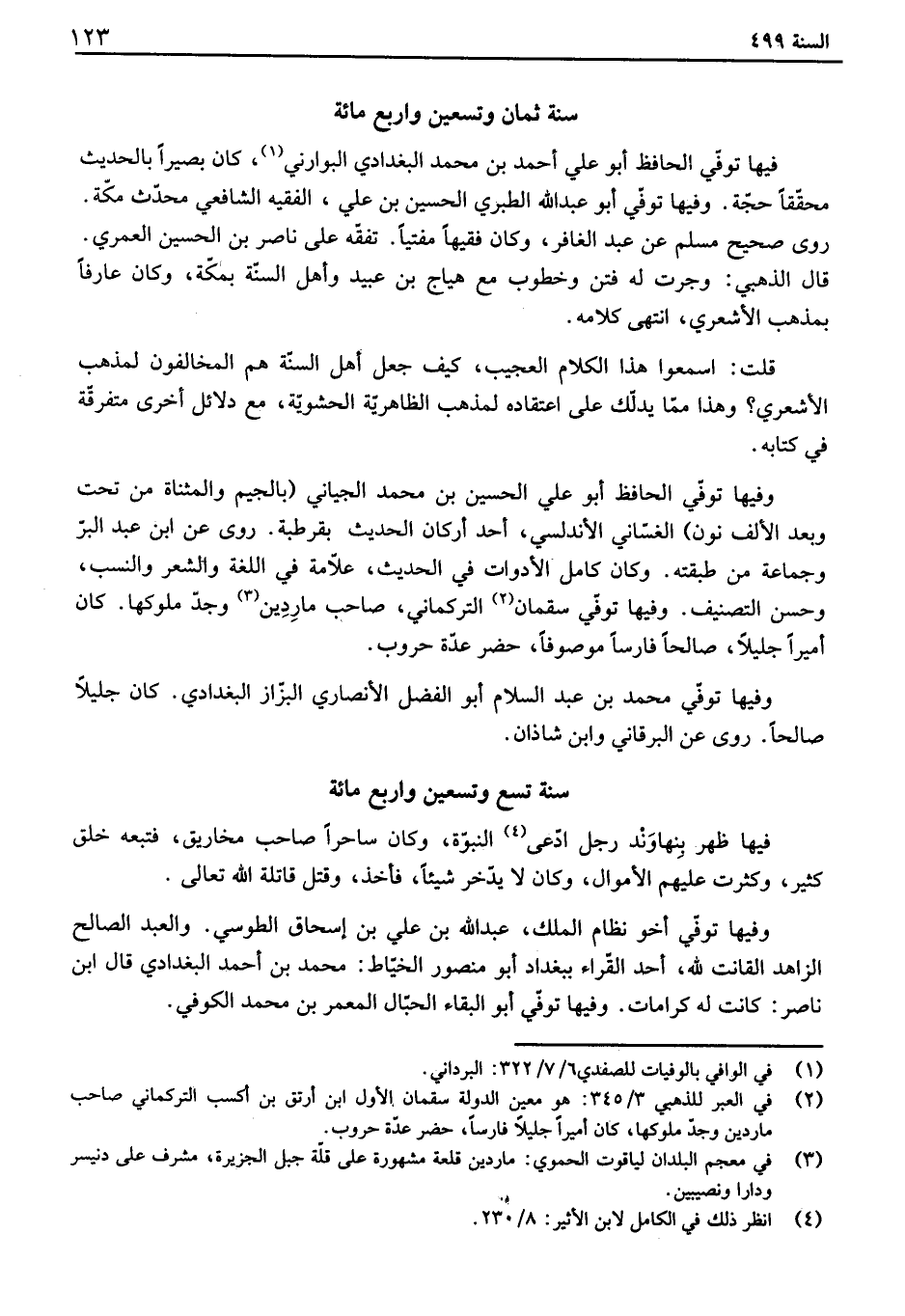 فيها توفي الحافظ أبو علي أحمد بن محمد البغدادي البوارني، كان بصيراً بالحديث محققاً حجة. وفيها توفي أبو عبد الله الطبري الحسين بن علي، الفقيه الشافعي محدث مكة. روى صحيح مسلم عن عبد الغافر، وكان فقيهاً مفتياً. تفقه على ناصر بن الحسين العمري. قال الذهبي: وجرت له فتن وخطوب مع هياج بن عبيد وأهل السنة بمكة، وكان عارفاً بمذهب الأشعري، انتهى كلامه. قلت: اسمعوا هذا الكلام العجيب، كيف جعل أهل السنة هم المخالفون لمذهب الأشعري؟ وهذا مما يدلك على اعتقاده لمذهب الظاهرية الحشوية، مع دلائل أخرى متفرقة في كتابه. وفيها توفي الحافظ أبو علي الحسين بن محمد الجياني بالجيم والمثناة من تحت وبعد الألف نون الغساني الأندلسي، أحد أركان الحديث بقرطبة. روى عن ابن عبد البر وجماعة من طبقته. وكان كامل الأدوات في الحديث، علامة في اللغة ولشعر والنسب، وحسن التصنيف. وفيها توفي سقمان التركماني، صاحب ماردين وجد ملوكها. كان أميراً جليلاً، صالحاً فارساً موصوفاً، حضر عدة حروب. وفيها توفي محمد بن عبد السلام أبو الفضل الأنصاري البزاز البغدادي. كان جليلاً صالحاً. روى عن البرقاني وابن شاذان.