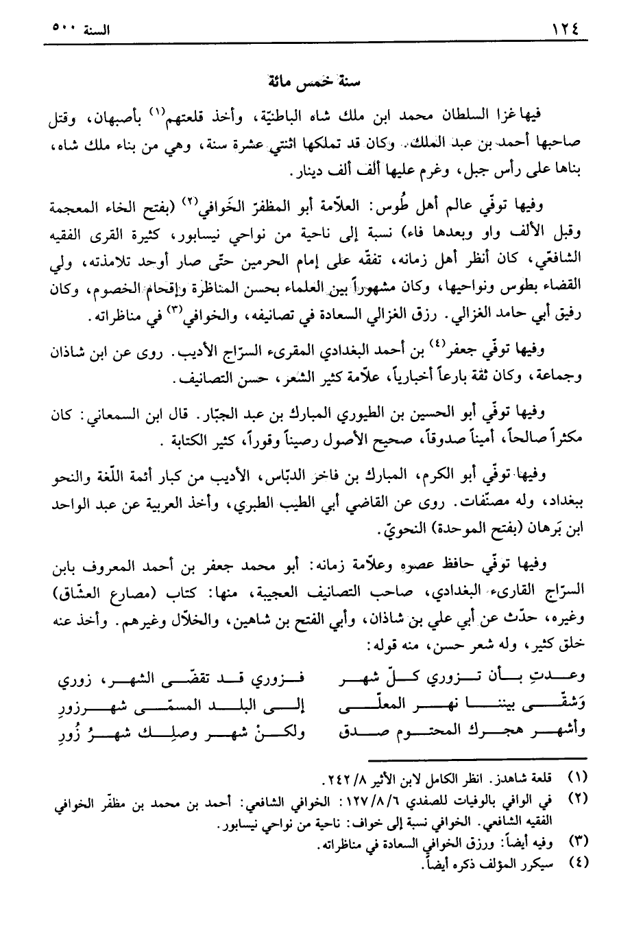 فيها غزا السلطان محمد ابن ملك شاه الباطنية، وأخذ قلعتهم بأصبهان، وقتل صاحبها أحمد بن عبد الملك. وكان قد تملكها اثنتي عشرة سنة، وهي من بناء ملك شاه، بناها على رأس جبل، وغرم عليها ألف ألف دينار. وفيها توفي عالم أهل طوس: العلأمة أبو المظفز الخوافي بفتح الخاء المعجمة وقبل الألف واو وبعدها فاء نسبة إلى ناحية من نواحي نيسابور، كثيرة القرى الفقيه الشافعي، كان أنظر أهل زمانه، تفقه على إمام الحرمين حتى صار أوحد تلامذته، ولي القضاء بطوس ونواحيها، وكان مشهوراً بين العلماء بحسن المناظرة وإقحام الخصوم، وكان رفيق أبي حامد الغزالي. رزق الغزالي السعادة في تصانيفه، والخوافي في مناظراته. وفيها توفي جعفر بن أحمد البغدادي المقرىء السراج الأديب. روى عن ابن شاذان وجماعة، وكان ثقة بارعاً أخبارياً، علامة كثير الشعر، حسن التصانيف. وفيها توفي أبو الحسين بن الطيوري المبارك بن عبد الجبار. قال ابن السمعاني: كان مكثراً صالحاً، أميناً صدوقاً، صحيح الأصول رصيناً وقوراً، كثير الكتابة. وفيها توفي أبو الكرم، المبارك بن فاخر الدباس، الأديب من كبار أئمة اللغة والنحو ببغداد، وله مصنفات. روى عن القاضي أبي الطيب الطبري، وأخذ العربية عن عبد الواحد ابن برهان بفتح الموحدة النحوي. وفيها توفي حافظ عصره وعلامة زمانه: أبو محمد جعفر بن أحمد المعروف بابن السراج القارىء البغدادي، صاحب التصانيف العجيبة، منها: كتاب مصارع العشاق وغيره، حدث عن أبي علي بن شاذان، وأبي الفتح بن شاهين، والخلال وغيرهم. وأخذ عنه خلق كثير، وله شعر حسن، منه قوله: