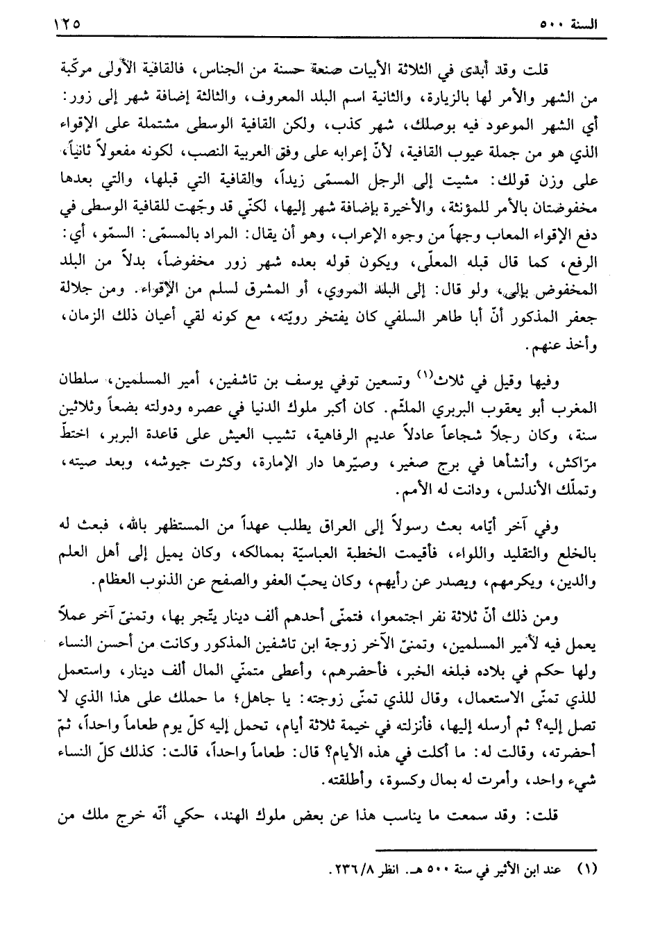 قلت وقد أبدى في الثلاثة الأبيات صنعة حسنة من الجناس، فالقافية الأولى مركبة من الشهر والأمر لها بالزيارة، والثانية اسم البلد المعروف، والثالثة إضافة شهر إلى زور: أي الشهر الموعود فيه بوصلك، شهر كذب، ولكن القافية الوسطى مشتملة على الإقواء الذي هو من جملة عيوب القافية، لأن إعرابه على وفق العربية النصب، لكونه مفعولاً ثانياً، على وزن قولك: مشيت إلى الرجل المسمى زيداً، والقافية التي قبلها، والتي بعدها مخفوضتان بالأمر للمؤنثة، والأخيرة بإضافة شهر إليها، لكني قد وجهت للقافية الوسطى في دفع الإقواء المعاب وجهاً من وجوه الإعراب، وهو أن يقال: المراد بالمسمى: السمو، أي: الرفع، كما قال قبله المعلى، ويكون قوله بعده شهر زور مخفوضاً، بدلاً من البلد المخفوض بإلى، ولو قال: إلى البلد المروي، أو المشرق لسلم من الإقواء. ومن جلالة جعفر المذكور أن أبا طاهر السلفي كان يفتخر رويته، مع كونه لقي أعيان ذلك الزمان، وأخذ عنهم. وفيها وقيل في ثلاث وتسعين توفي يوسف بن تاشفين، أمير المسلمين، سلطان المغرب أبو يعقوب البربري الملثم. كان أكبر ملوك الدنيا في عصره ودولته بضعاً وثلاثين سنة، وكان رجلاً شجاعاً عادلاً عديم الرفاهية، تشيب العيش على قاعدة البربر، اختط مراكش، وأنشأها في برج صغير، وصيرها دار الإمارة، وكثرت جيوشه، وبعد صيته، وتملك الأندلس، ودانت له الأمم. وفي آخر أيامه بعث رسولاً إلى العراق يطلب عهداً من المستظهر بالله، فبعث له بالخلع والتقليد واللواء، فأقيمت الخطبة العباسية بممالكه، وكان يميل إلى أهل العلم والدين، ويكرمهم، ويصدر عن رأيهم، وكان يحب العفو والصفح عن الذنوب العظام. ومن ذلك أن ثلاثة نفر اجتمعوا، فتمنى أحدهم ألف دينار يتجر بها، وتمنى آخر عملاً يعمل فيه لأمير المسلمين، وتمنى الآخر زوجة ابن تاشفين المذكور وكانت من أحسن النساء ولها حكم في بلاده فبلغه الخبر، فأحضرهم، وأعطى متمني المال ألف دينار، واستعمل للذي تمنى الاستعمال، وقال للذي تمنى زوجته: يا جاهل؛ ما حملك على هذا الذي لا تصل إليه؟ ثم أرسله إليها، فأنزلته في خيمة ثلاثة أيام، تحمل إليه كل يوم طعاماً واحداً، ثم أحضرته، وقالت له: ما أكلت في هذه الأيام؟ قال: طعاماً واحداً، قالت: كذلك كل النساء شيء واحد، وأمرت له بمال وكسوة، وأطلقته. قلت: وقد سمعت ما يناسب هذا عن بعض ملوك الهند، حكي أنه خرج ملك من
