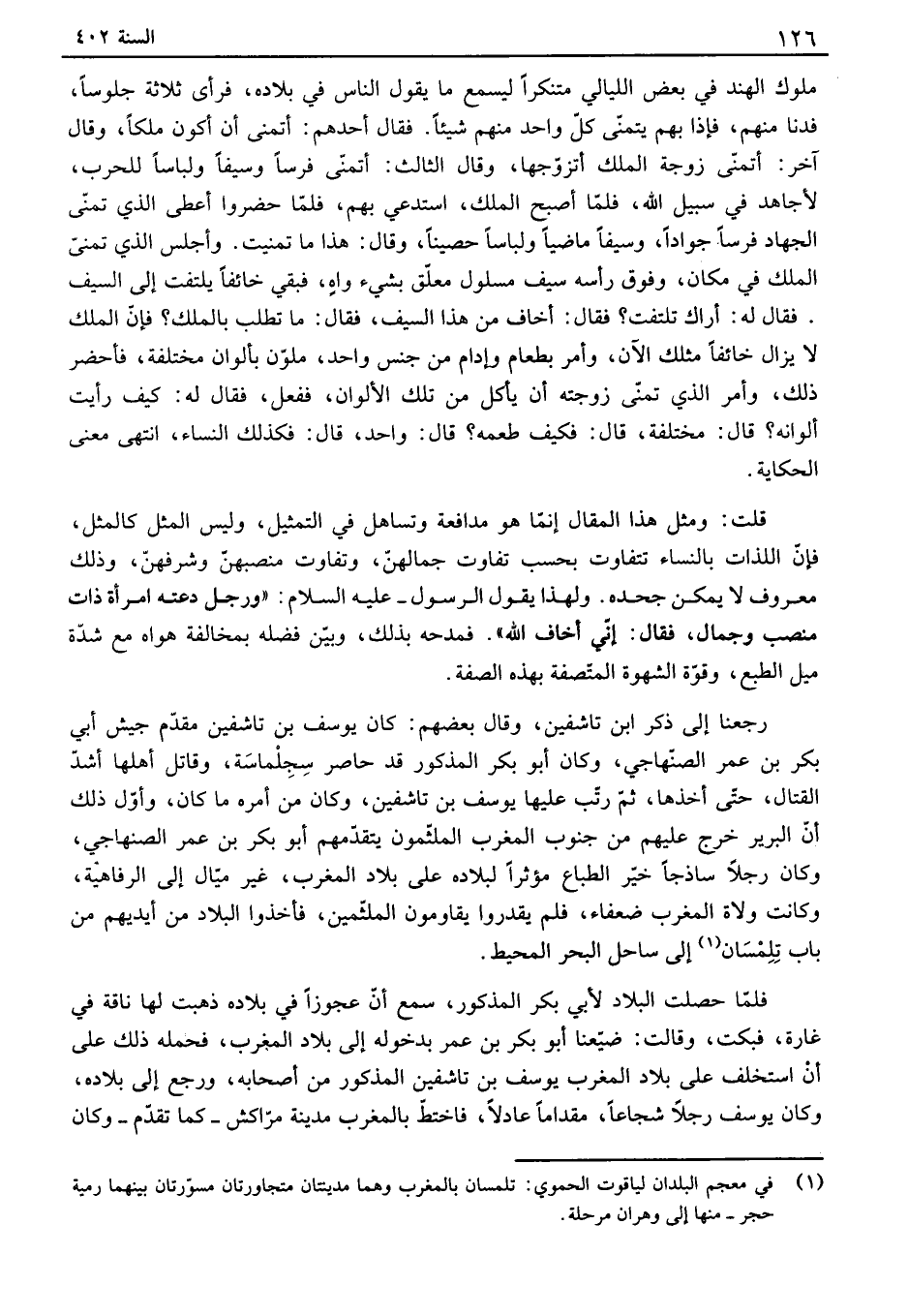 ملوك الهند في بعض الليالي متنكراً ليسمع ما يقول الناس في بلاده، فرأى ثلاثة جلوساً، فدنا منهم، فإذا بهم يتمنى كل واحد منهم شيئاً. فقال أحدهم: أتمنى أن أكون ملكاً، وقال آخر: أتمنى زوجة الملك أتزوجها، وقال الثالث: أتمنى فرساً وسيفاً ولباساً للحرب، لأجاهد في سبيل الله، فلما أصبح الملك، استدعي بهم، فلما حضروا أعطى الذي تمنى الجهاد فرساً جواداً، وسيفاً ماضياً ولباساً حصيناً، وقال: هذا ما تمنيت. وأجلس الذي تمنى الملك في مكان، وفوق رأسه سيف مسلول معلق بشيء واه، فبقي خائفاً يلتفت إلى السي. فقال له: أراك تلتفت؟ فقال: أخاف من هذا السيف، فقال: ما تطلب بالملك؟ فإن الملك لا يزال خائفاً مثلك الآن، وأمر بطعام وإدام من جنس واحد، ملون بألوان مختلفة، فأحضر ذلك، وأمر الذي تمنى زوجته أن يأكل من تلك الألوان، ففعل، فقال له: كيف رأيت ألوانه؟ قال: مختلفة، قال: فكيف طعمه؟ قال: واحد، قال: فكذلك النساء، انتهى معنى الحكاية. قلت: ومثل هذا المقال إنما هو مدافعة وتساهل في التمثيل، وليس المثل كالمثل، فإن اللذات بالنساء تتفاوت بحسب تفاوت جمالهن، وتفاوت منصبهن وشرفهن، وذلك معروف لا يمكن جحده. ولهذا يقول الرسول - عليه السلام: " ورجل دعته امرأة ذات منصب وجمال، فقال: إني أخاف الله ". فمدحه بذلك، وبين فضله بمخالفة هواه مع شدة ميل الطبع، وقوة الشهوة المتصفة بهذه الصفة. رجعنا إلى ذكر ابن تاشفين، وقال بعضهم: كان يوسف بن تاشفين مقدم جيش أبي بكر بن عمر الصنهاجي، وكان أبو بكر المذكور قد حاصر سجلماسة، وقاتل أهلها أشد القتال، حتى أخذها، ثم رتب عليها يوسف بن تاشفين، وكان من أمره ما كان، وأول ذلك أن البرير خرج عليهم من جنوب المغرب الملثمون يتقدمهم أبو بكر بن عمر الصنهاجي، وكان رجلاً ساذجاً خير الطباع مؤثراً لبلاده على بلاد المغرب، غير ميال إلى الرفاهية، وكانت ولاة المغرب