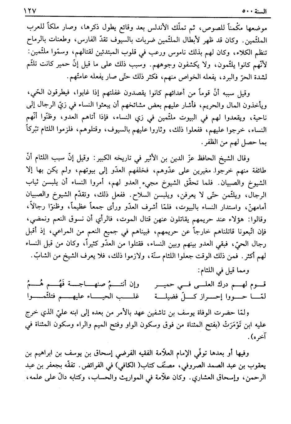 موضعها مكمناً للصوص، ثم تملك الأندلس بعد وقائع يطول ذكرها، وصار ملكاً للعرب الملثمين. وكان قد ظهر لأبطال الملثمين ضربات بالسيوف تقد الفارس، وطعنات بالرماح تنظم الكلاء، وكان لهم بذلك ناموس ورعب في قلوب المبتدئين لقتالهم، وسموا ملثمين: لأنهم كانوا يلثمون، ولا يكشفون وجوههم. وسبب ذلك على ما قيل إن حمير كانت تلثم لشدة الحر والبرد، يفعله الخواص منهم، فكثر ذلك حتى صار يفعله عامتهم. وقيل سببه أن قوماً من أعدائهم كانوا يقصدون غفلتهم إذا غابوا، فيطرقون الحي، ويأخذون المال والحريم، فأشار عليهم بعض مشائخهم أن يبعثوا النساء في زي الرجال إلى ناحية، ويقعدوا لهم في البيوت ملثمين في زي النساء، فإذا أتاهم العدو، وظنوا أنهم النساء، خرجوا عليهم، ففعلوا ذلك، وثاروا عليهم بالسيوف، وقتلوهم، فلزموا اللثام تبركاً بما حصل لهم من الظفر. وقال الشيخ الحافظ عز الدين بن الأثير في تاريخه الكبير: وقيل إن سبب اللثام أن طائفة منهم خرجوا. مغيرين على عدوهم، فخلفهم العدو إلى بيوتهم، ولم يكن بها إلا الشيوخ والصبيان. فلما تحقق الشيوخ مجيء العدو لهم، أمروا النساء أن يلبسن ثياب الرجال، ويلثمن حتى لا يعرفن، ويلبسن السلاح. ففعل ذلك، وتقدم الشيوخ والصبيان أمامهن، واستدار النساء بالبيوت، فلما أشرف العدو ورأى جمعاً عظيماً، وظنوا رجالاً، وقالوا: هؤلاء عند حريمهم يقاتلون عنهن قتال الموت، فالرأي أن نسوق النعم ونمضي، فإن اتبعونا قاتلناهم خارجاً عن حريمهم، فبيناهم في جميع النعم من المراعي، إذ أقبل رجال الحي، فبقي العدو بينهم وبين النساء، فقتلوا من العدو كثيراً، وكان من قبل النساء لهم أكثر. فمن ذلك الوقت جعلوا اللثام سنة، ولازموا ذلك، فلا يعرف الشيخ من الشاب. ومما قيل في اللثام: