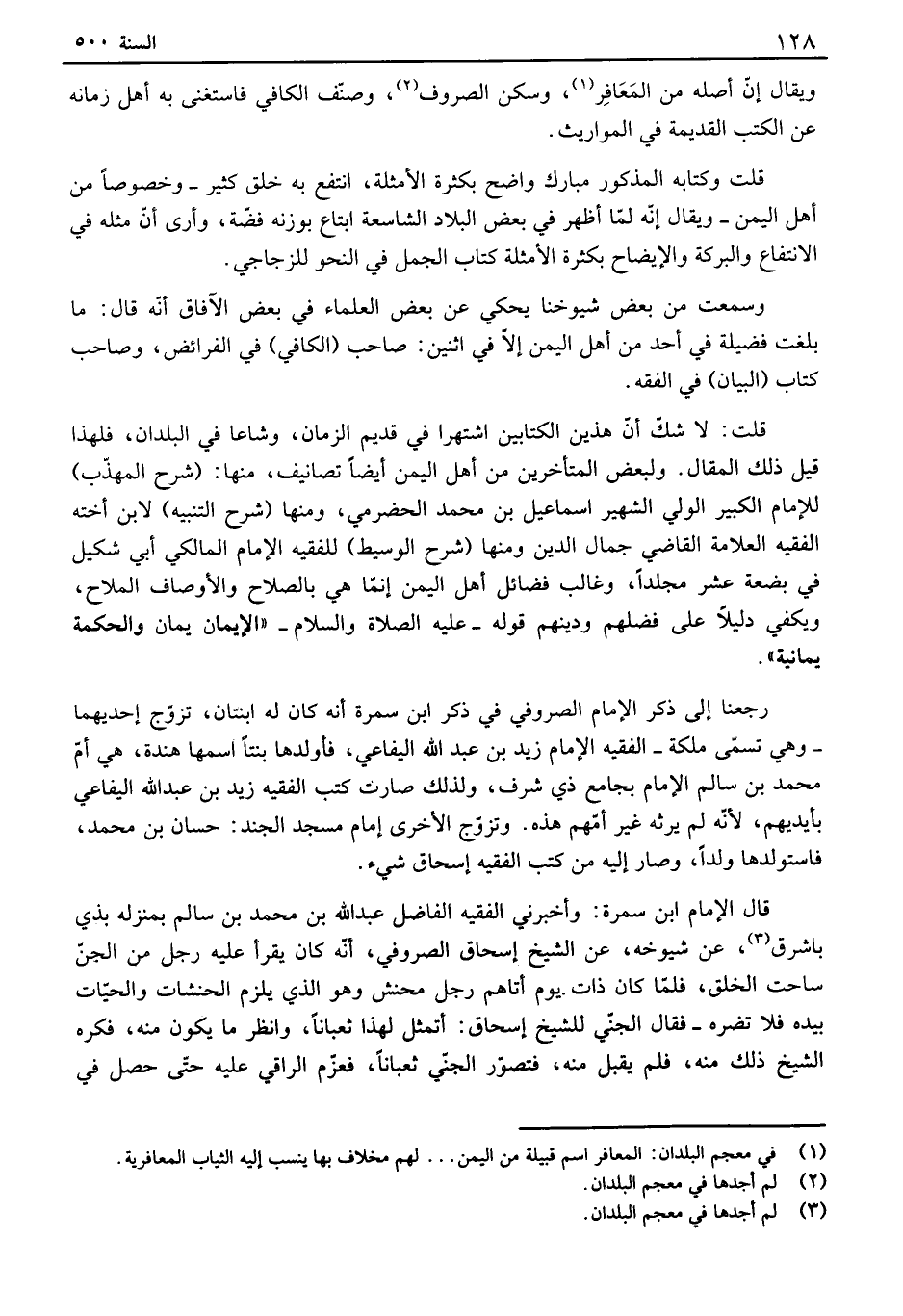 ويقال إن أصله من المعافر، وسكن الصروف، وصنف الكافي فاستغنى به أهل زمانه عن الكتب القديمة في المواريث. قلت وكتابه المذكور مبارك واضح بكثرة الأمثلة، انتفع به خلق كثير - وخصوصاً من أهل اليمن - ويقال إنه لما أظهر في بعض البلاد الشاسعة ابتاع بوزنه فضة، وأرى أن مثله في الانتفاع والبركة والإيضاح بكثرة الأمثلة كتاب الجمل في النحو للزجاجي. وسمعت من بعض شيوخنا يحكي عن بعض العلماء في بعض الآفاق أنه قال: ما بلغت فضيلة في أحد من أهل اليمن إلا في اثنين: صاحب الكافي في الفرائض، وصاحب كتاب البيان في الفقه. قلت: لا شك أن هذين الكتابين اشتهرا في قديم الزمان، وشاعا في البلدان، فلهذا قيل ذلك المقال. ولبعض المتأخرين من أهل اليمن أيضاً تصانيف، منها: شرح المهذب للإمام الكبير الولي الشهير اسماعيل بن محمد الحضرمي، ومنها شرح التنبيه لابن أخته الفقيه العلامة القاضي جمال الدين ومنها شرح الوسيط للفقيه الإمام المالكي أبي شكيل في بضعة عشر مجلداً، وغالب فضائل أهل اليمن إنما هي بالصلاح والأوصاف الملاح، ويكفي دليلاً على فضلهم ودينهم قوله - عليه الصلاة والسلام - " الأيمان يمان والحكمة يمانية ". رجعنا إلى ذكر الإمام الصروفي في ذكر ابن سمرة أنه كان له ابنتان، تزوج إحديهما - وهي تسمى ملكة - الفقيه الإمام زيد بن عبد الله اليفاعي، فأولدها بنتاً اسمها هندة، هي أم محمد بن سالم الإمام بجامع ذي شرف، ولذلك صارت كتب الفقيه زيد بن عبد الله اليفاعي بأيديهم، لأنه لم يرثه غير أمهم هذه. وتزوج الأخرى إمام مسجد الجند: حسان بن محمد، فاستولدها ولداً، وصار إليه من كتب الفقيه إسحاق شيء. قال الإمام ابن سمرة: وأخبرني الفقيه الفاضل عبد الله بن محمد بن سالم بمنزله بذي باشرق، عن شيوخه، عن الشيخ إسحاق الصروفي، أنه كان يقرأ عليه رجل من الجن ساحت الخلق، فلما كان ذات يوم أتاهم رجل محنش وهو الذي يلزم الحنشات والحيات بيده فلا تضره - فقال الجني للشيخ إسحاق: أتمثل لهذا ثعباناً، وانظر ما يكون منه، فكره الشيخ ذلك منه، فلم يقبل منه، فتصور الجني ثعباناً، فعزم الراقي عليه حتى حصل في